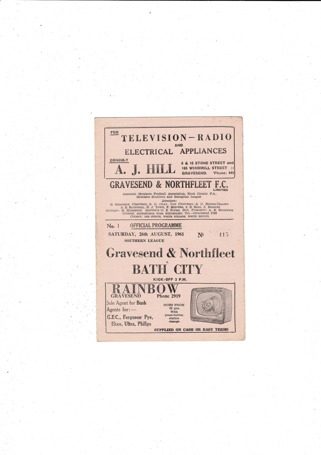 1961/62 Gravesend & Northfleet v Bath City Football Programme
