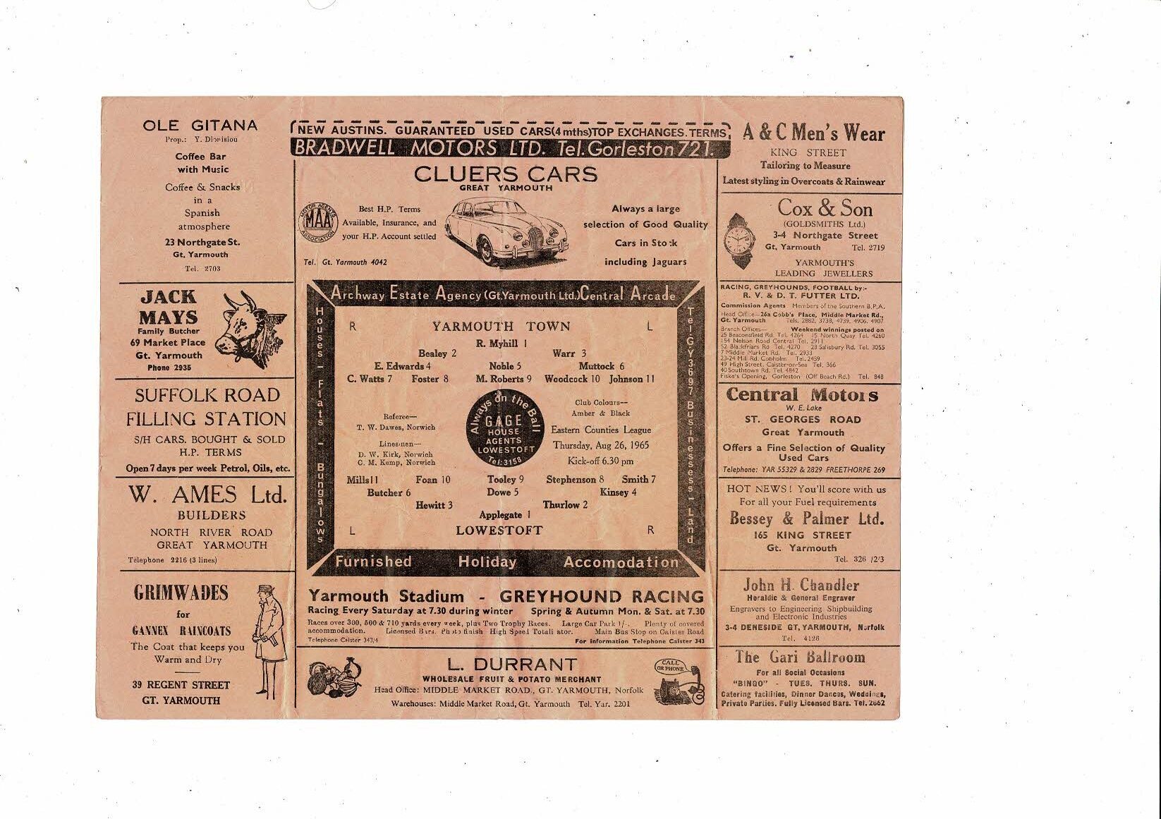 1964/65 Gt. Yarmouth Town v Lowestoft Eastern Counties League Football Programme