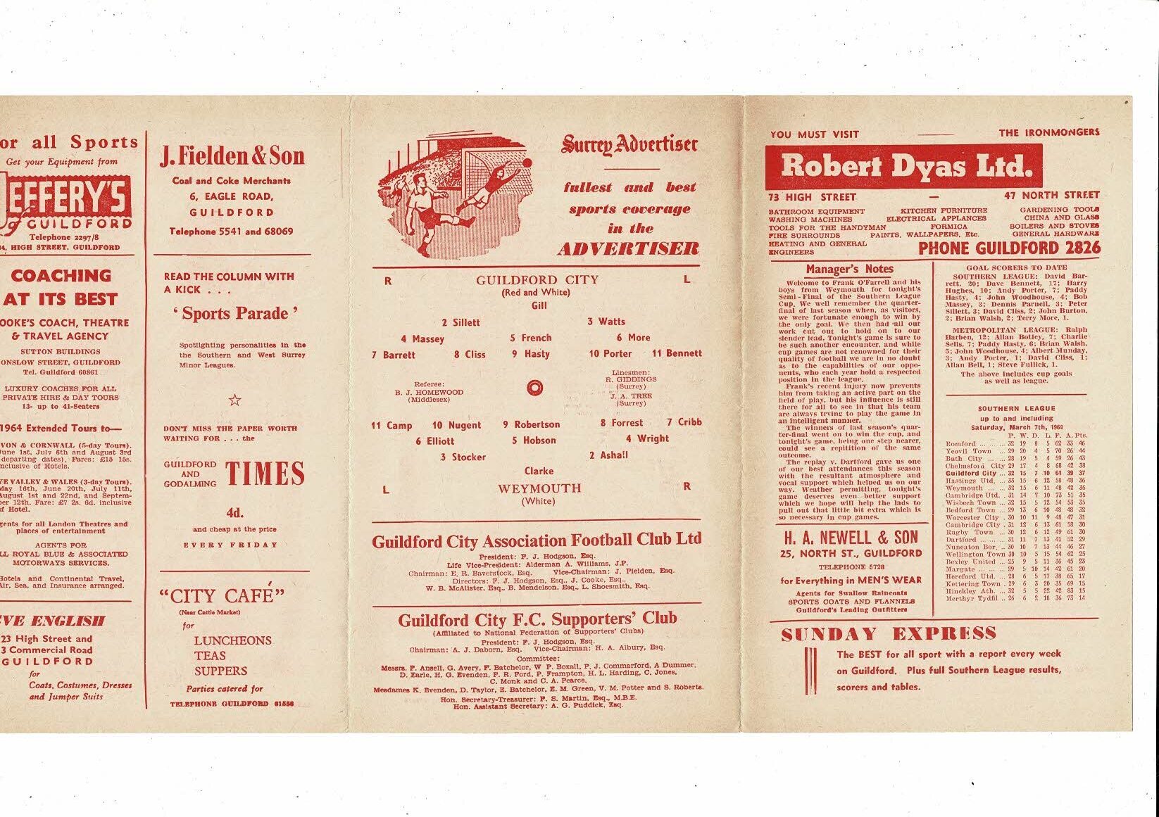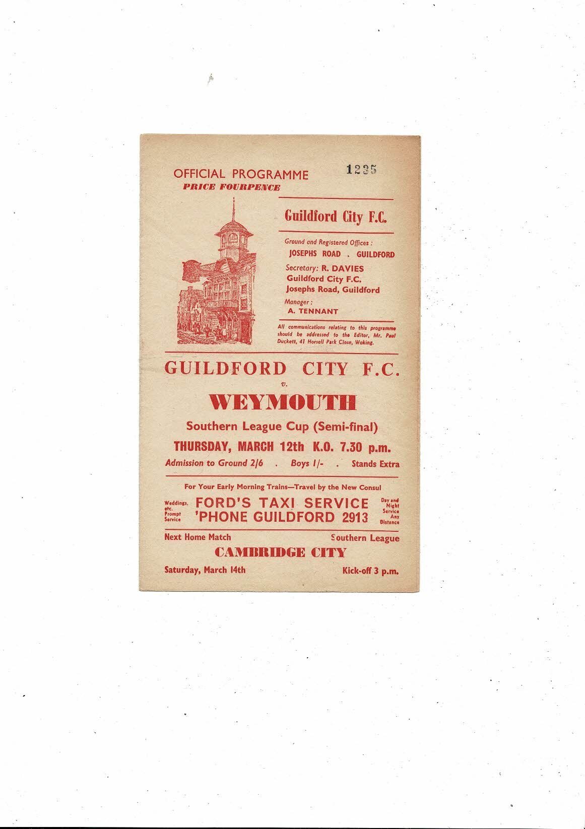 1963/64 Guildford City v Weymouth Southern League Cup Semi Final Programme