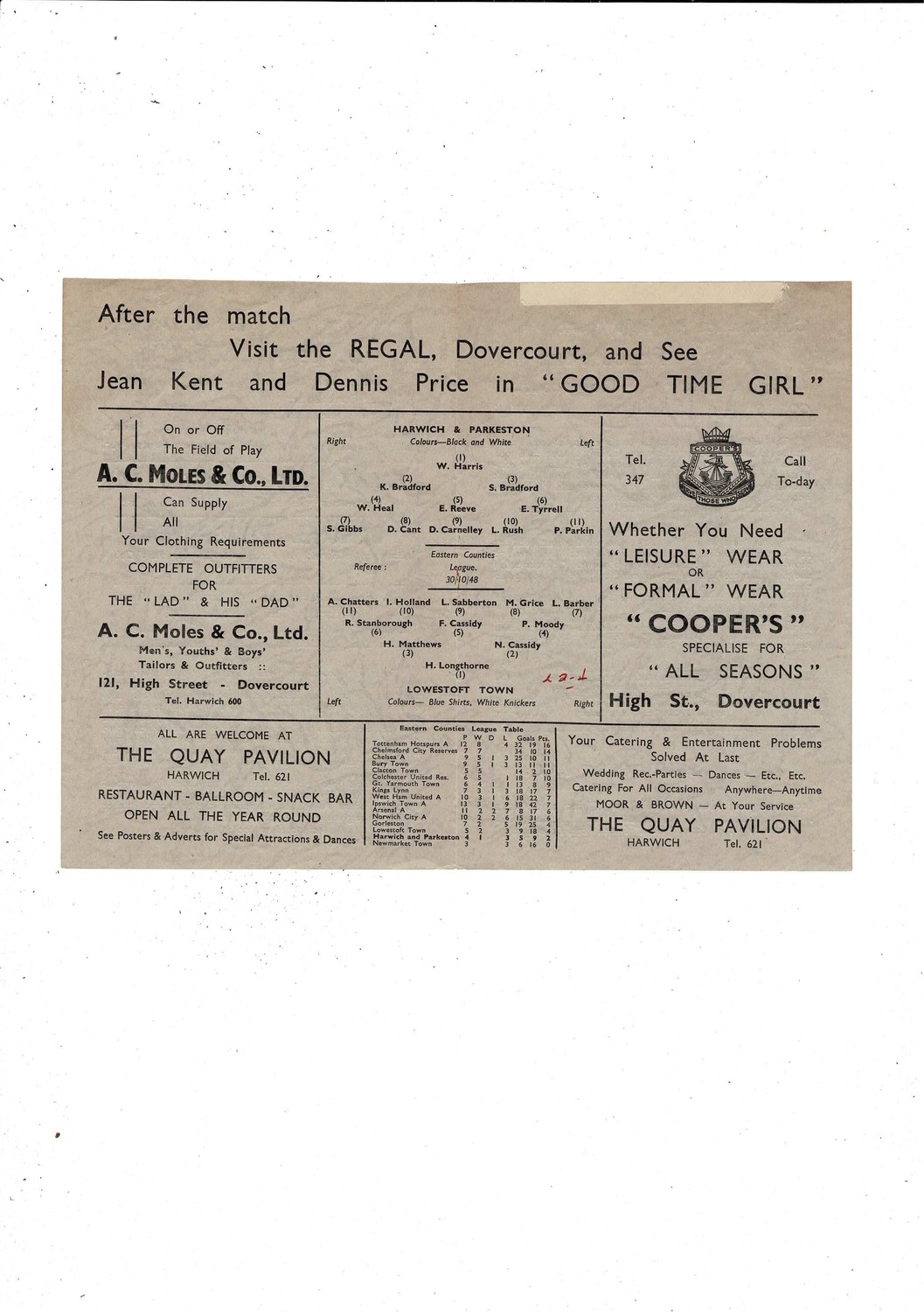 1948/49 Harwich & Parkeston v Lowestoft Town Football Programme