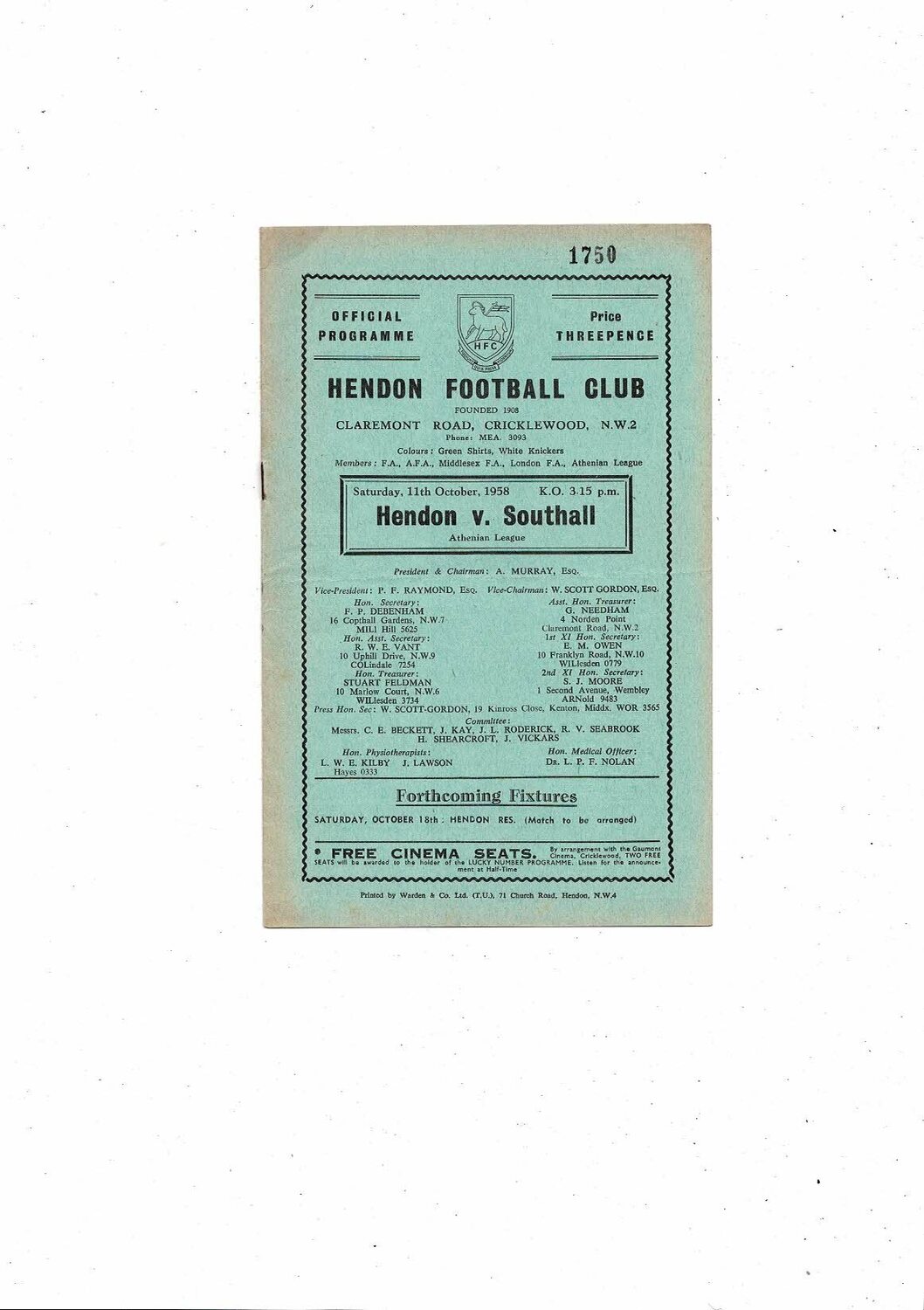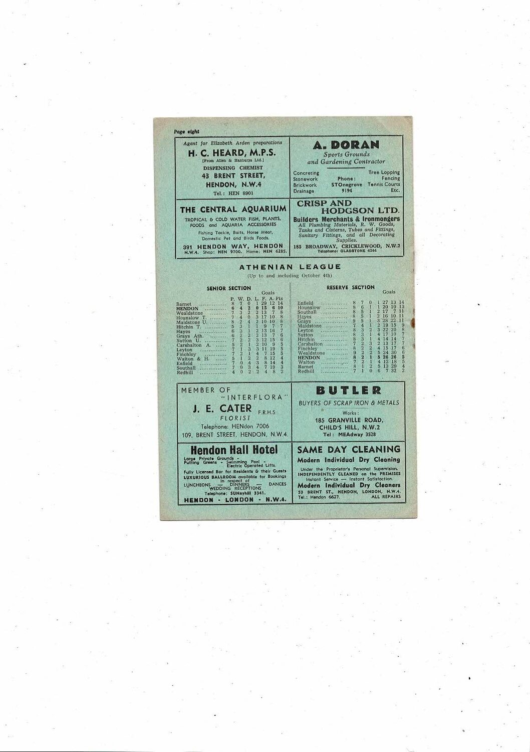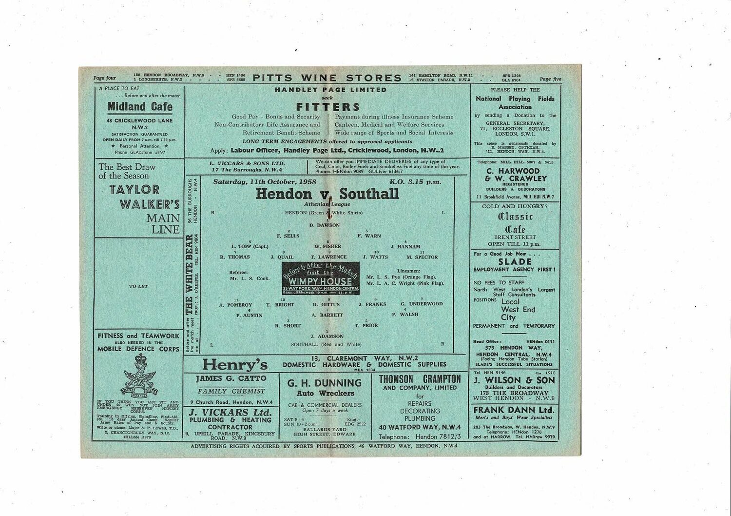 1958/59 Hendon v Southall Athenian League Football Programme