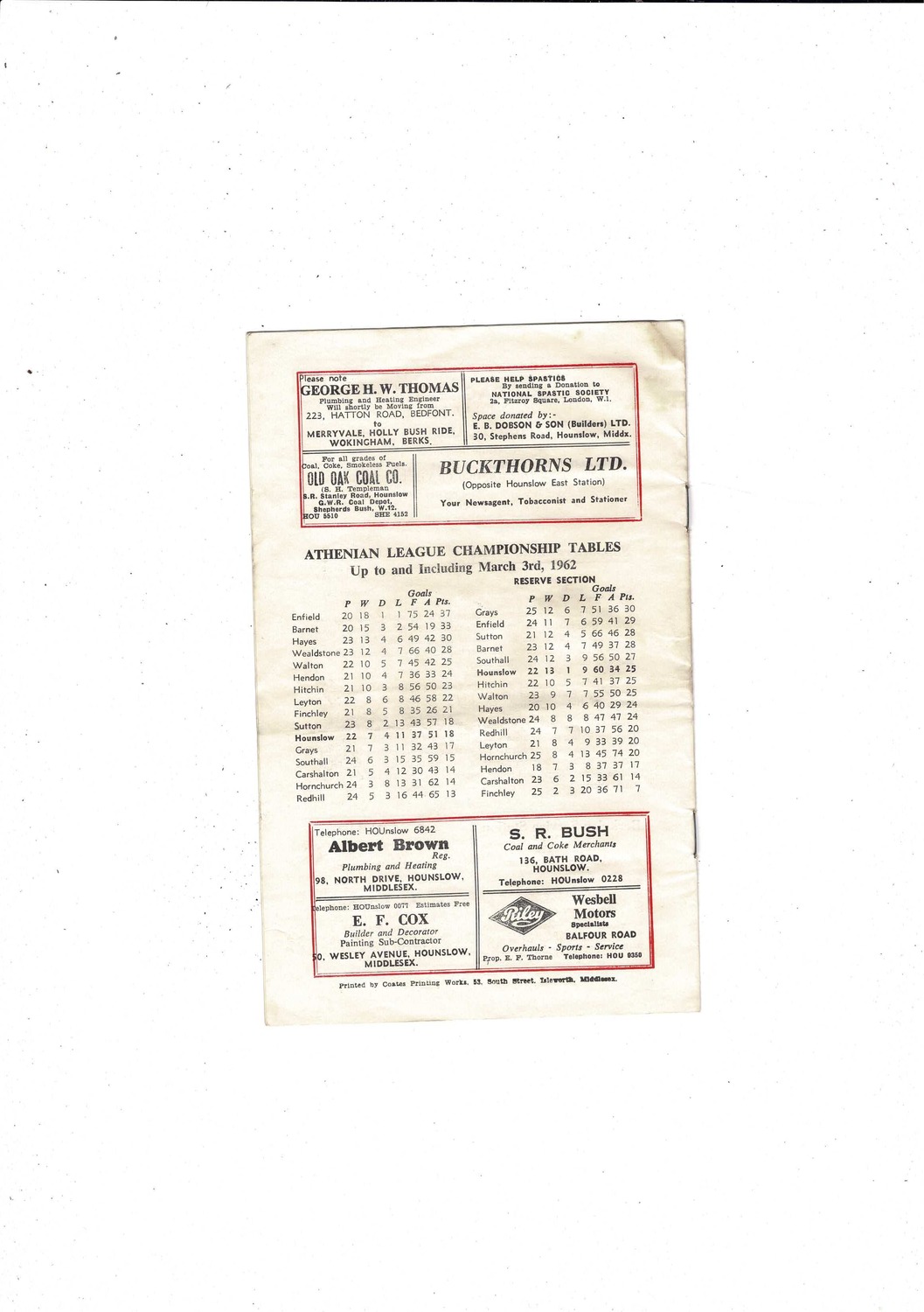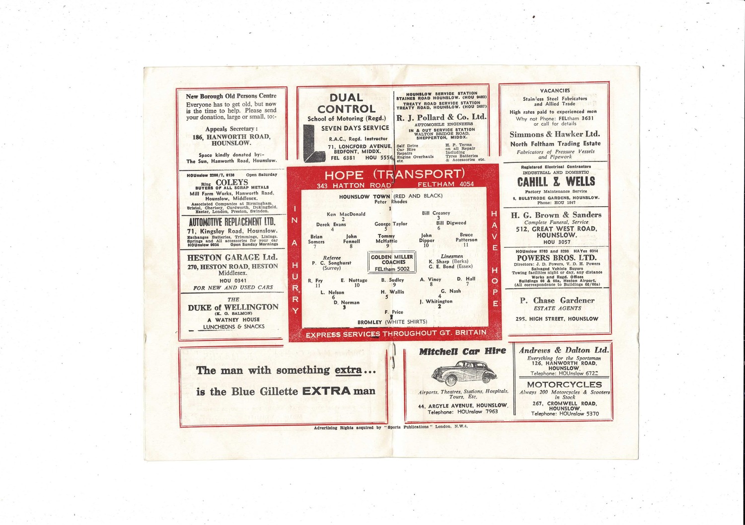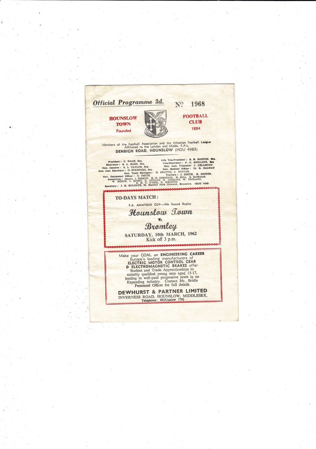 1961/62 Hounslow Town v Bromley Amateur Cup Replay Football Programme