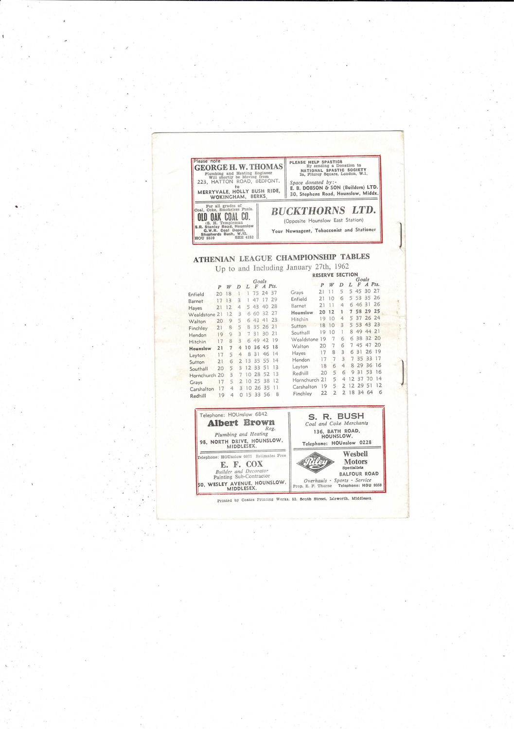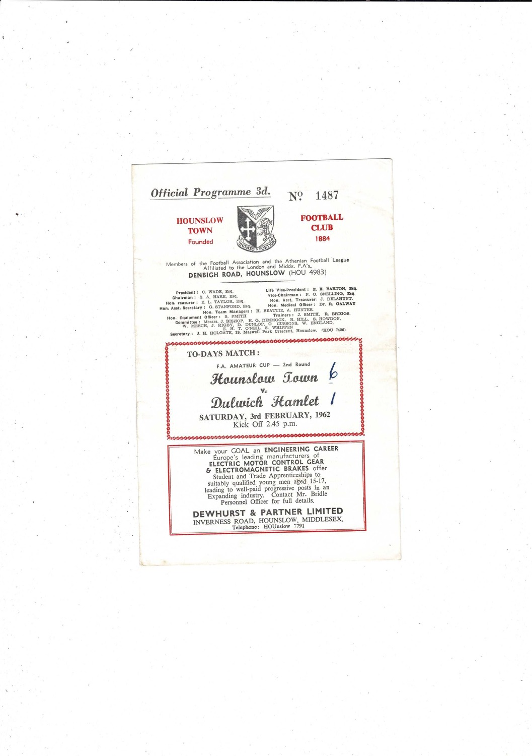 1961/62 Hounslow Town v Dulwich Hamlet FA Amateur Cup Football Programme