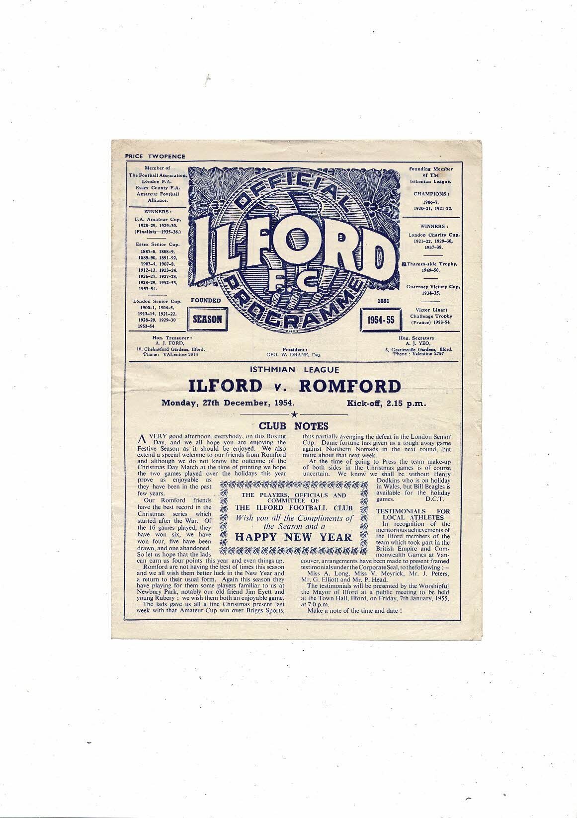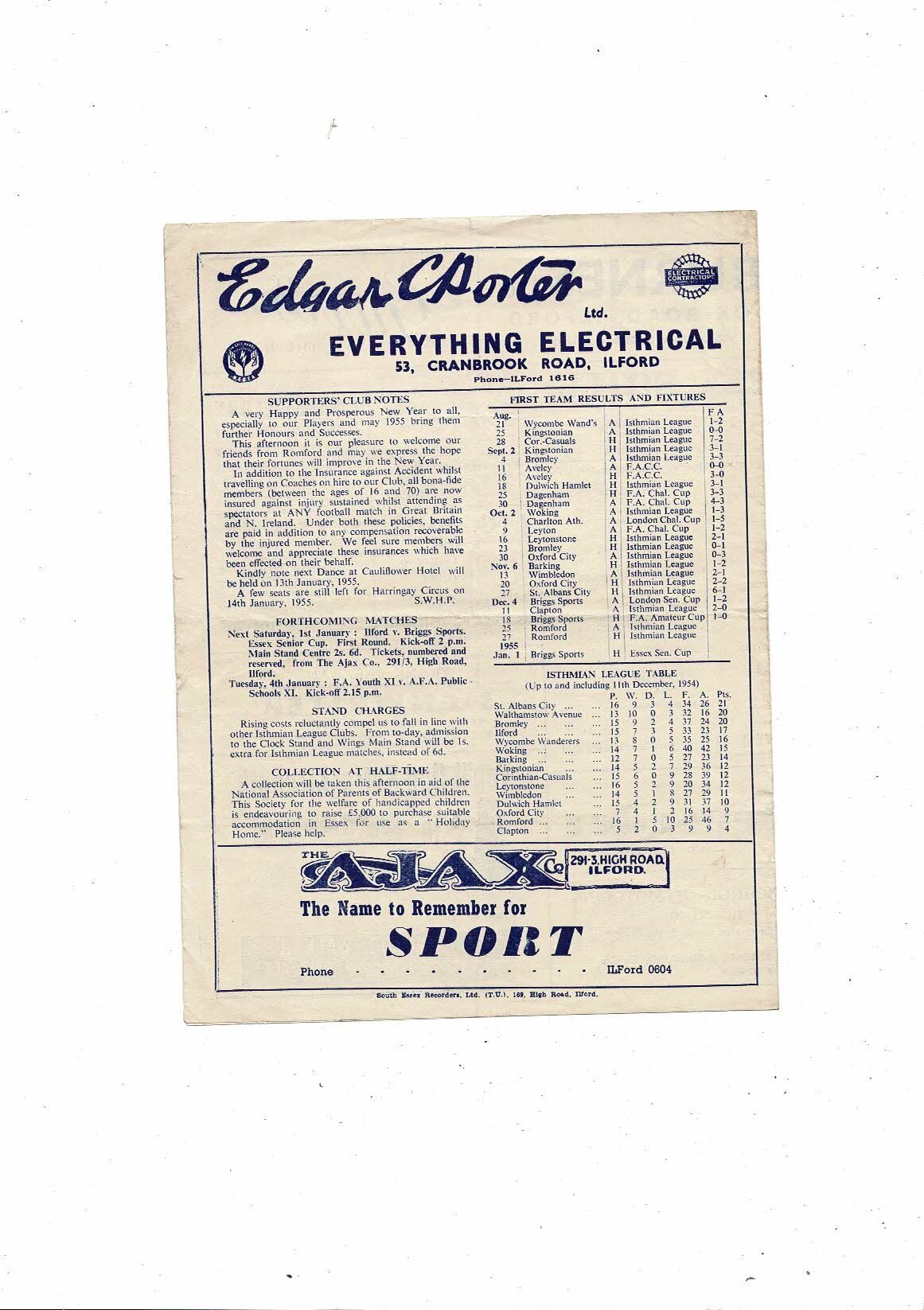 1954/55 Ilford v Romford Isthmian League Football Programme