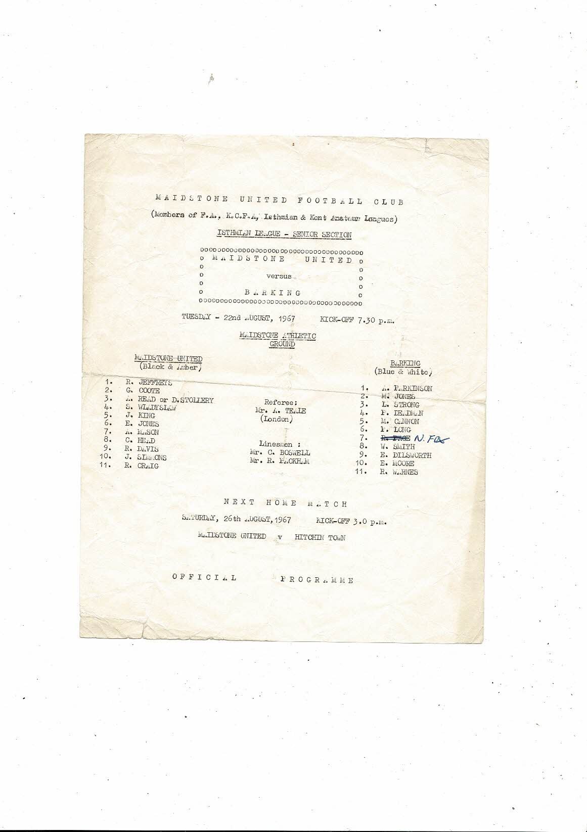 1967/68 Maidstone United v Barking Isthmian League Football Programme