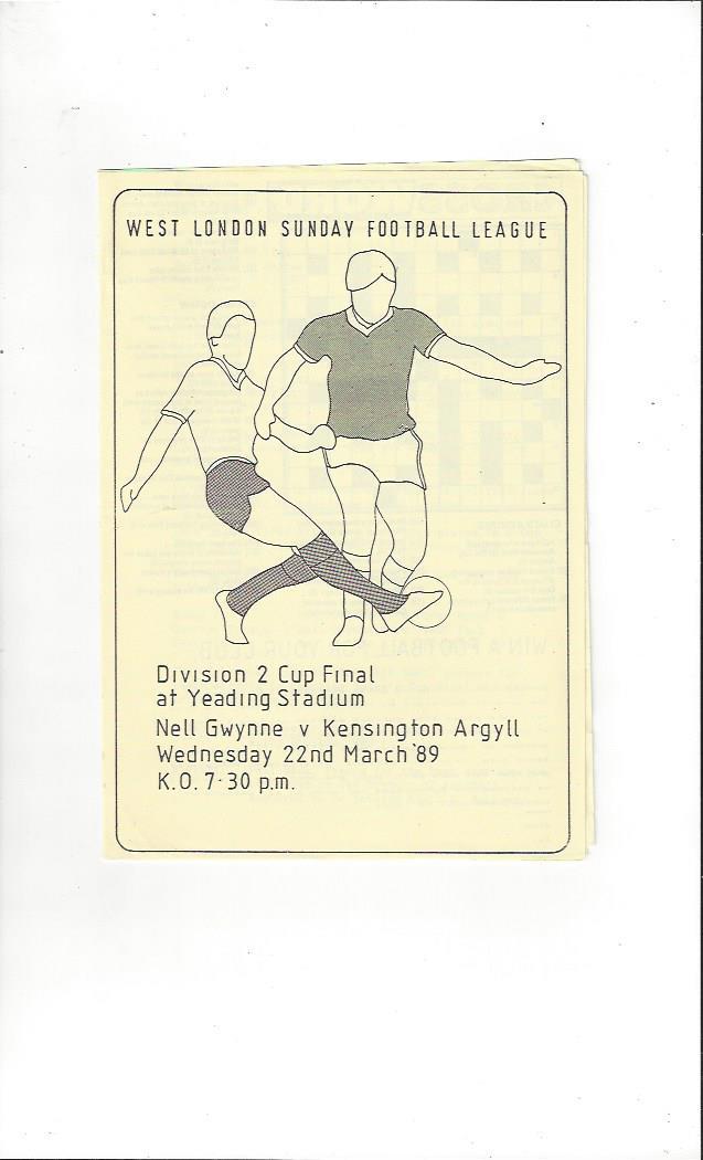 1988/89 Nell Gwynne v Kensington Argyll Sunday Div 2 Cup Final Football Programme @ Yeading
