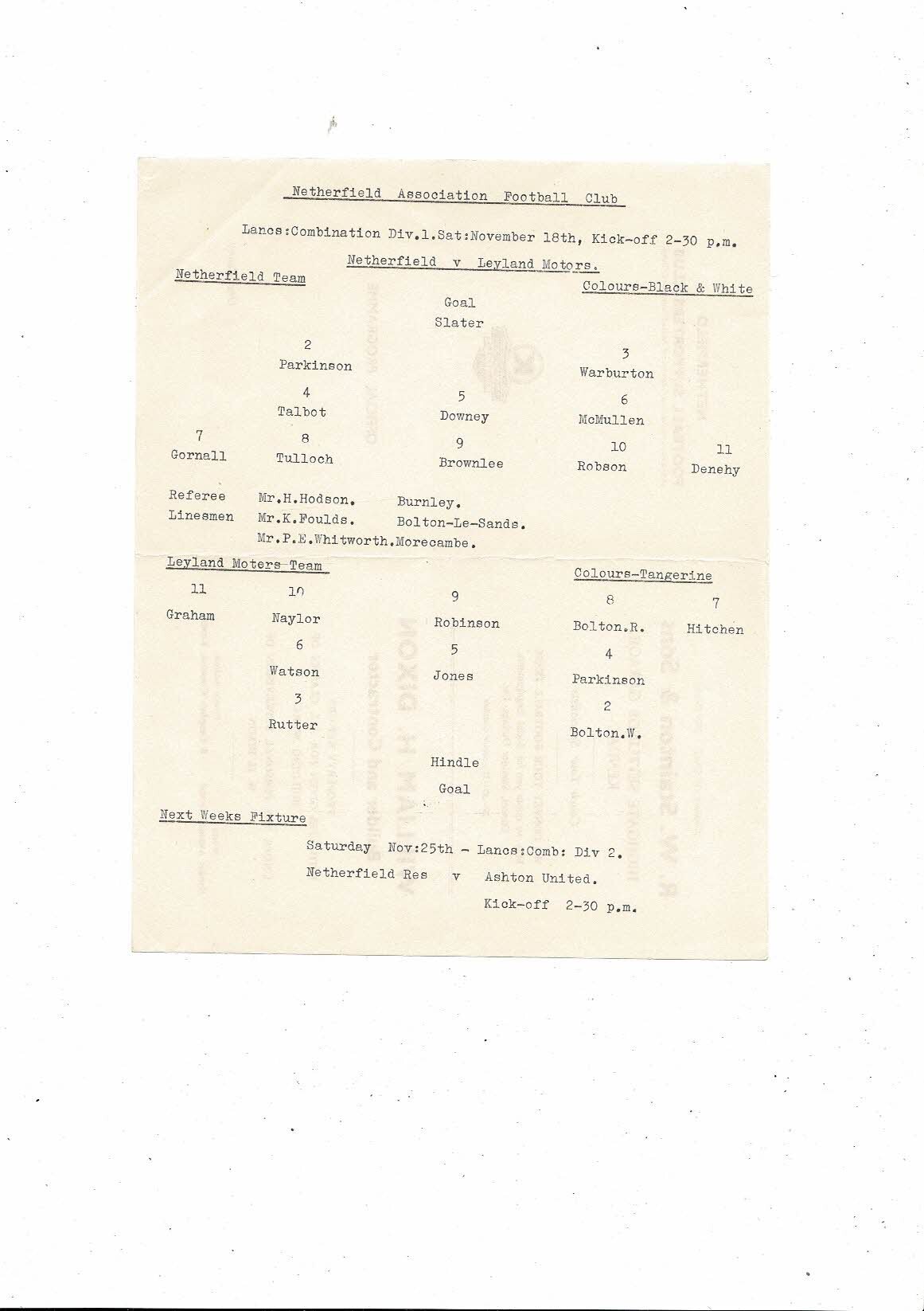 1961/62 Netherfield v Leyland Motors Lancs Combination Football Programme