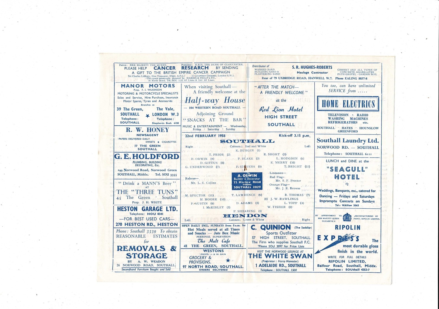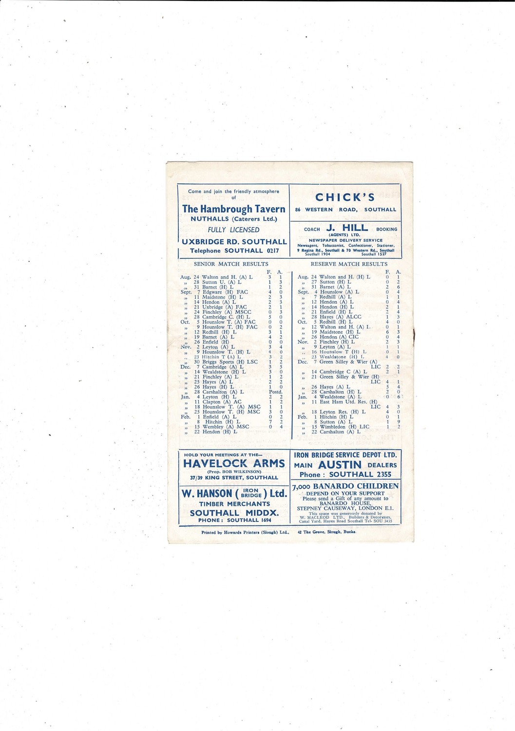 1957/58 Southall v Hendon Athenian League Football Programme