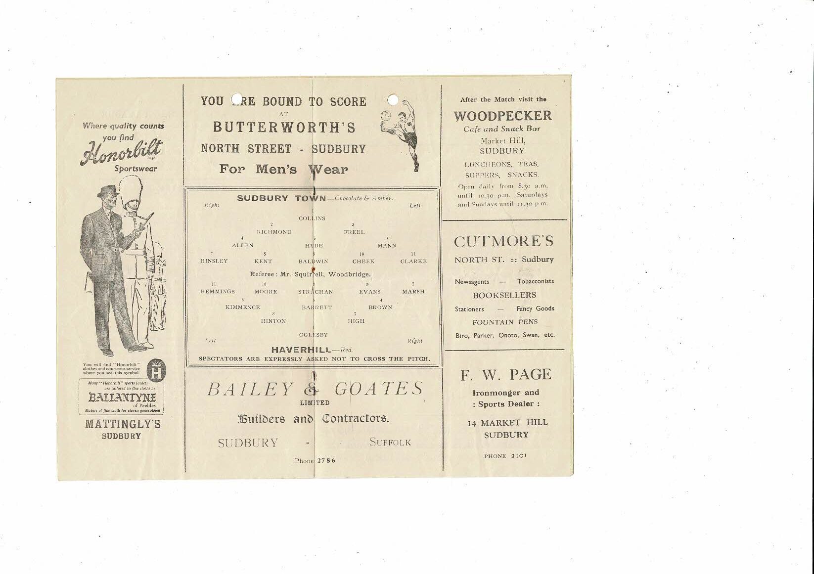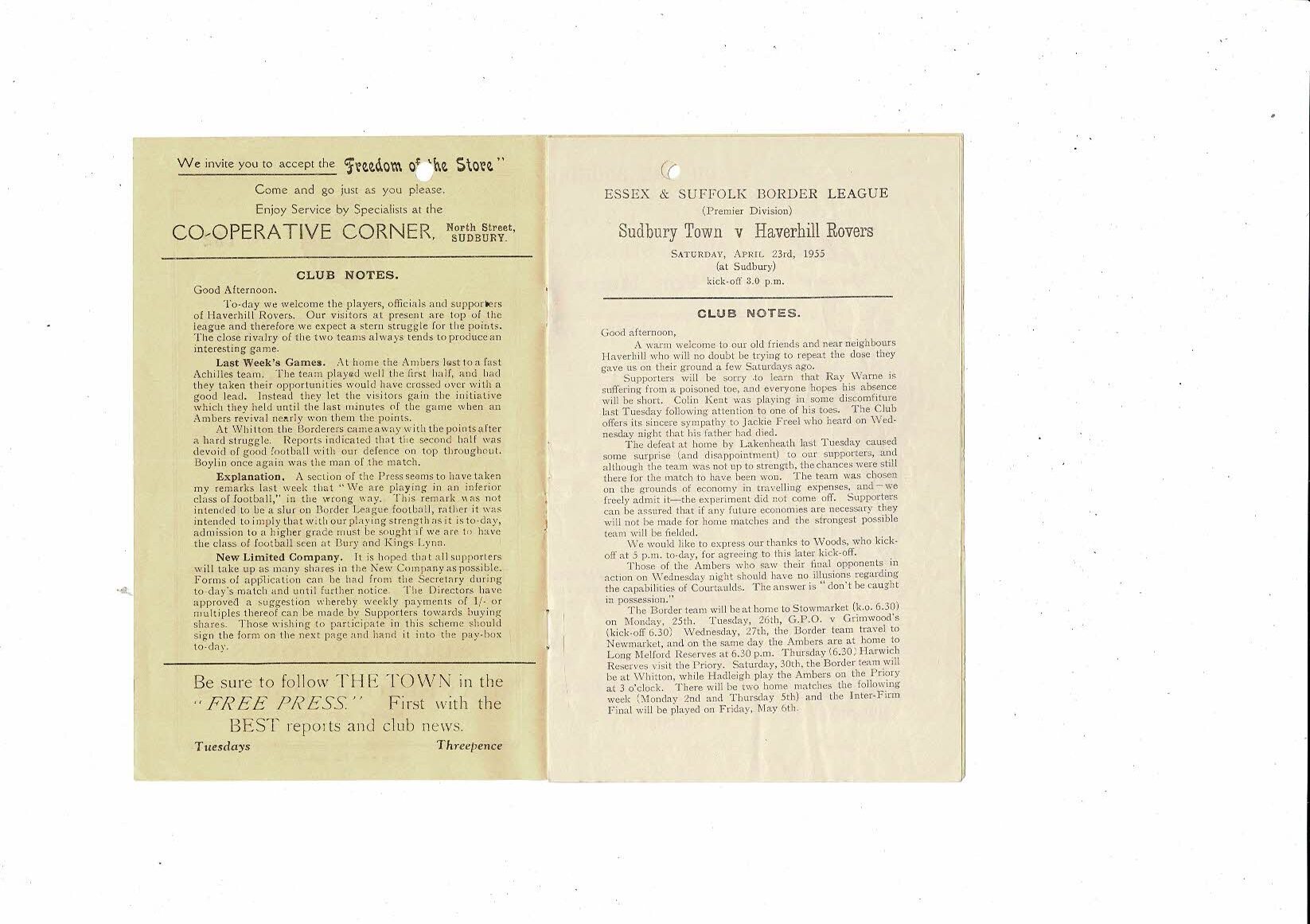 1951/52 Sudbury Town v Haverhill Essex & Suffolk Border League Programme