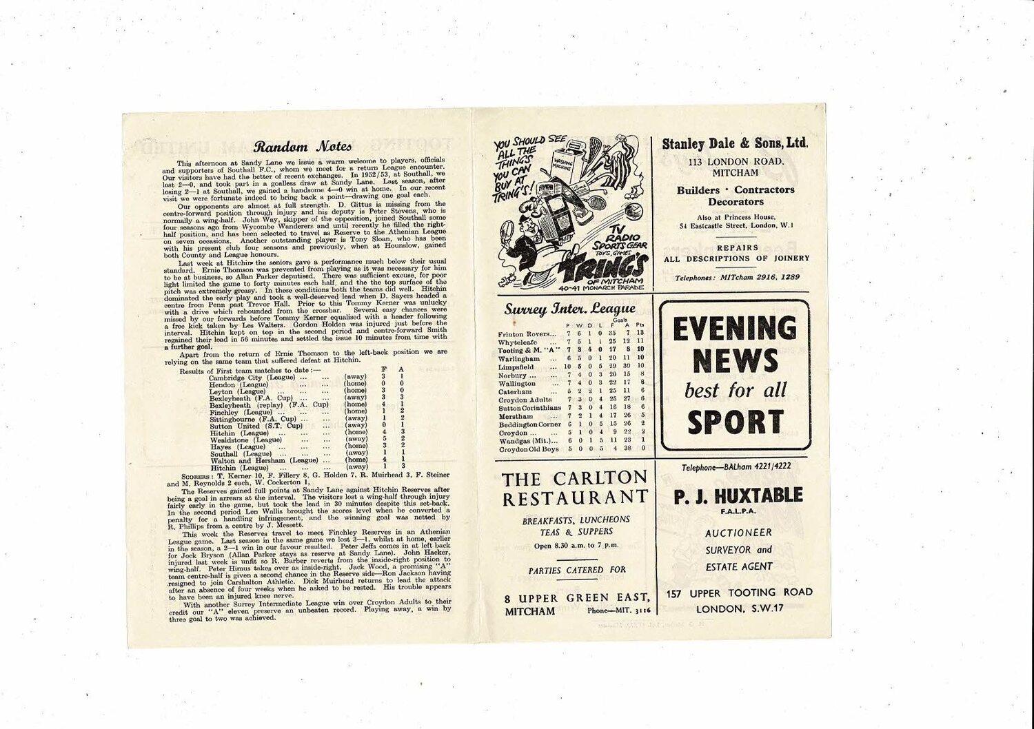 1954/55 Tooting & Mitcham v Southall Athenian League Football Programme