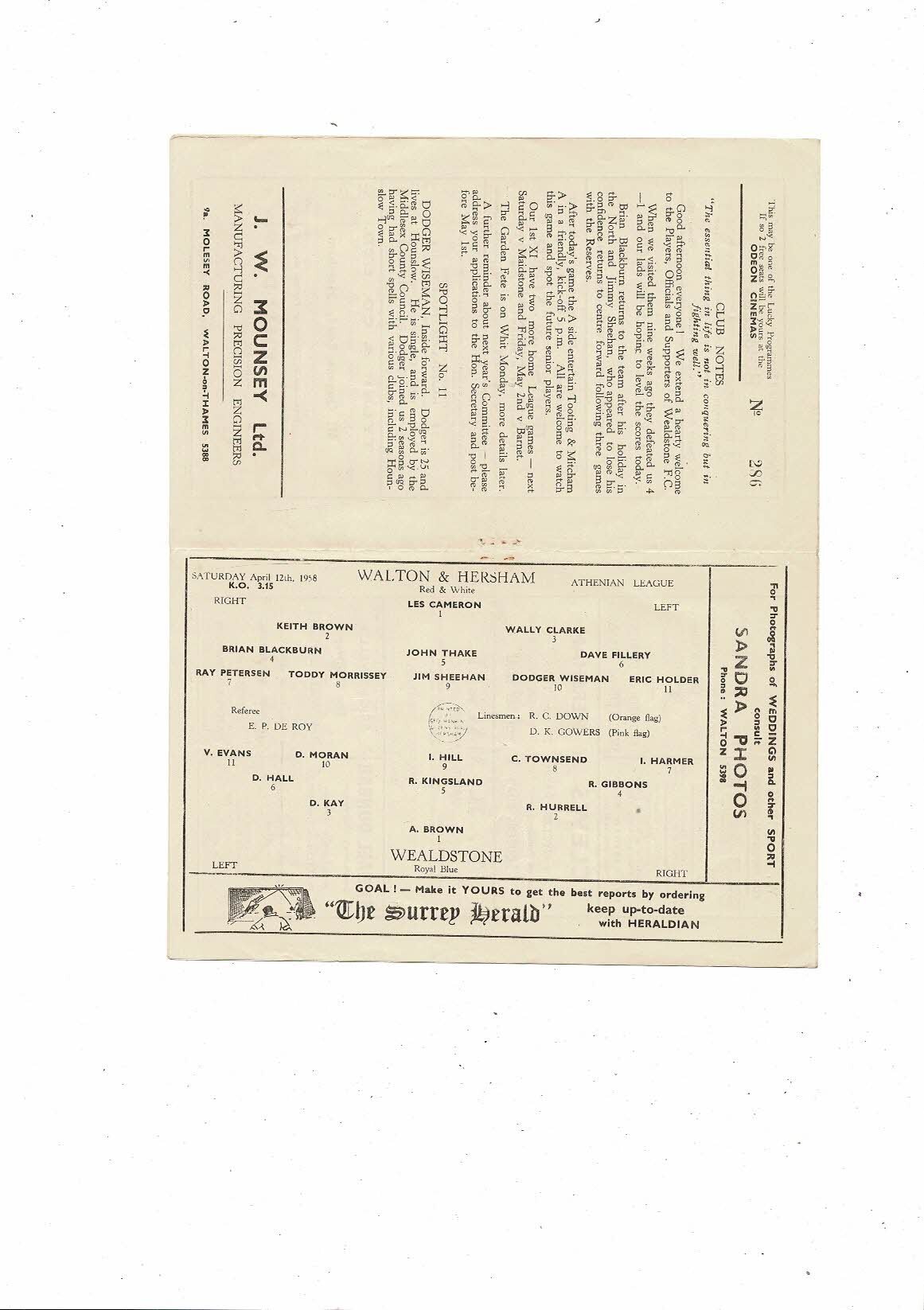 1957/58 Walton & Hersham v Wealdstone Athenian League Football Programme
