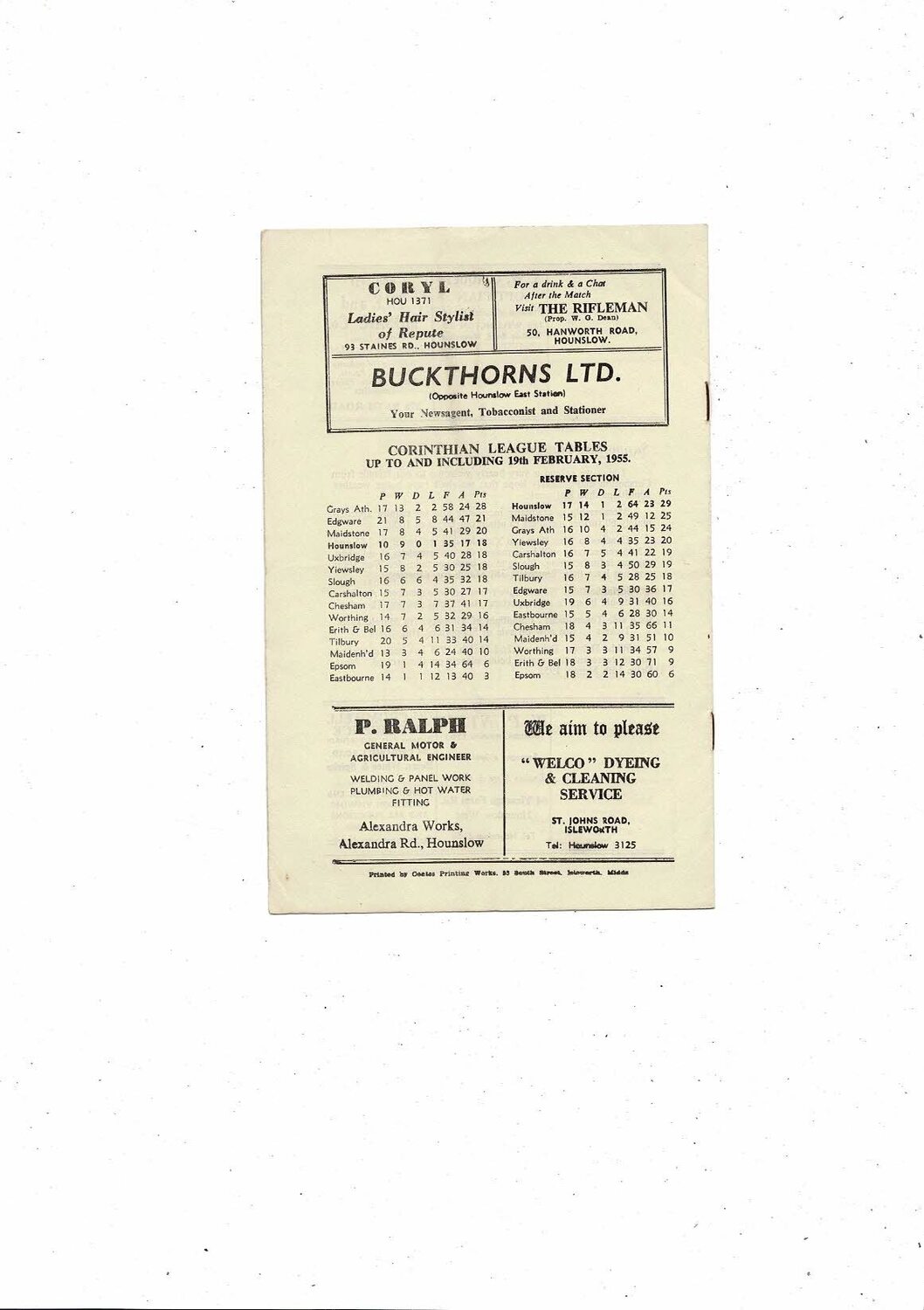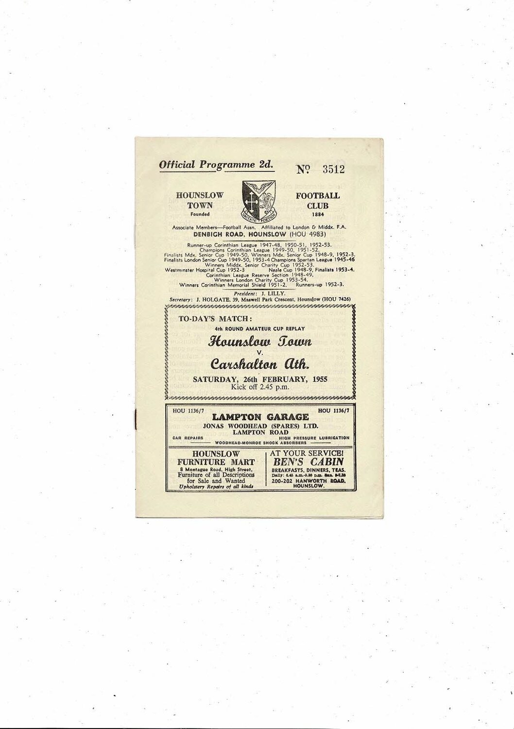 1954/55 Hounslow Town v Carshalton Athletic Amateur Cup Replay Football Programme