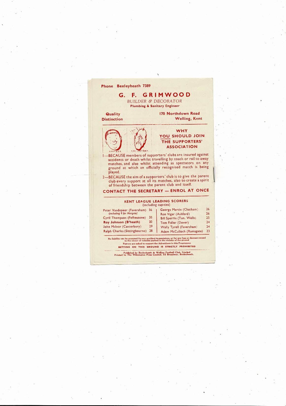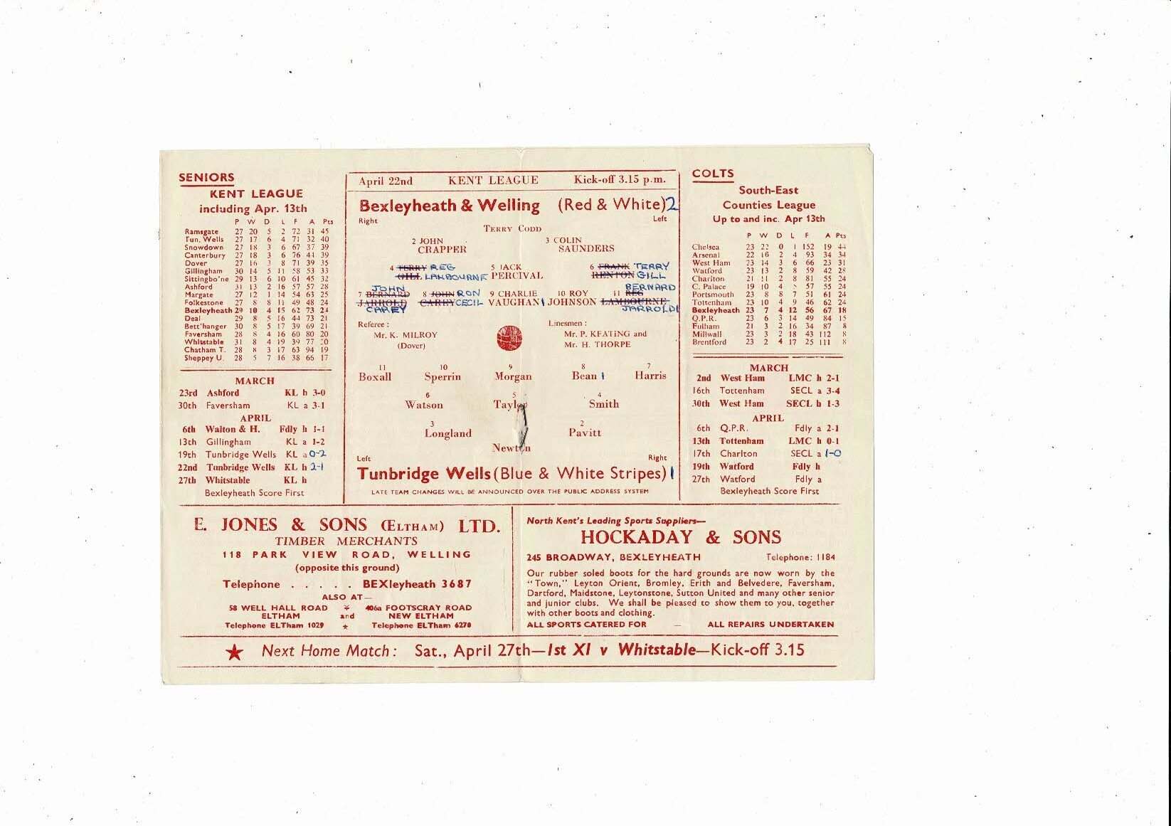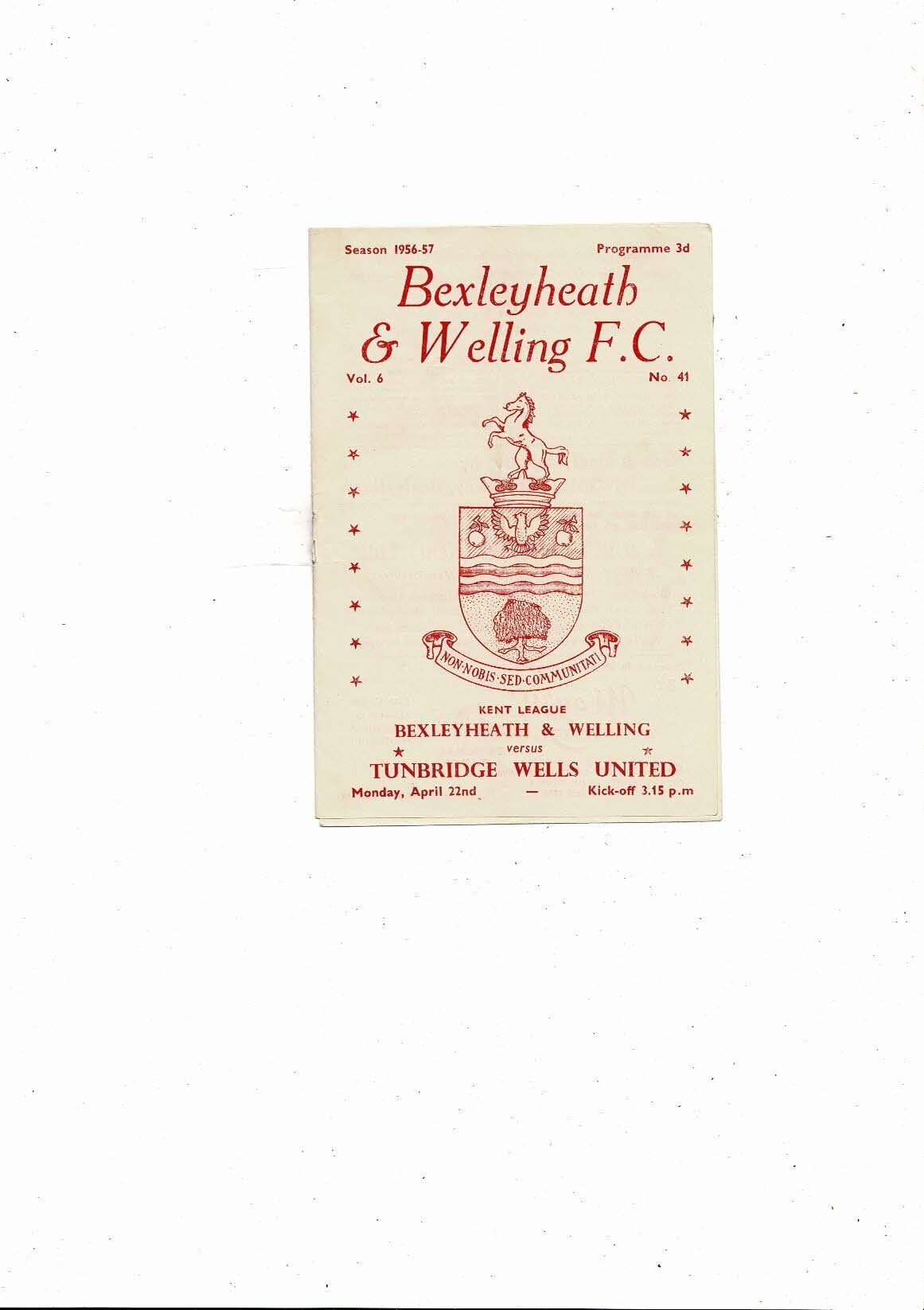 1956/57 Bexleyheath & Welling v Tunbridge Wells United Kent League Programme