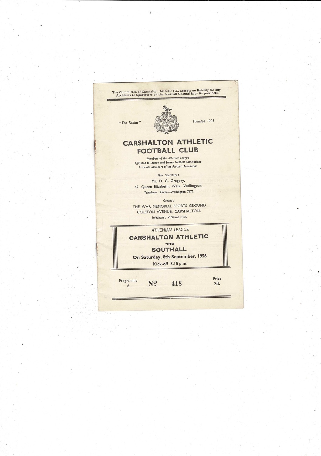 1956/57 Carshalton Athletic v Southall Football Programme