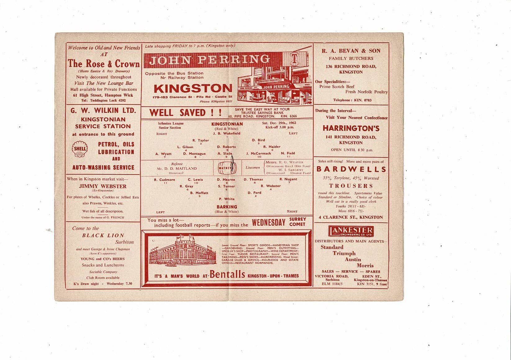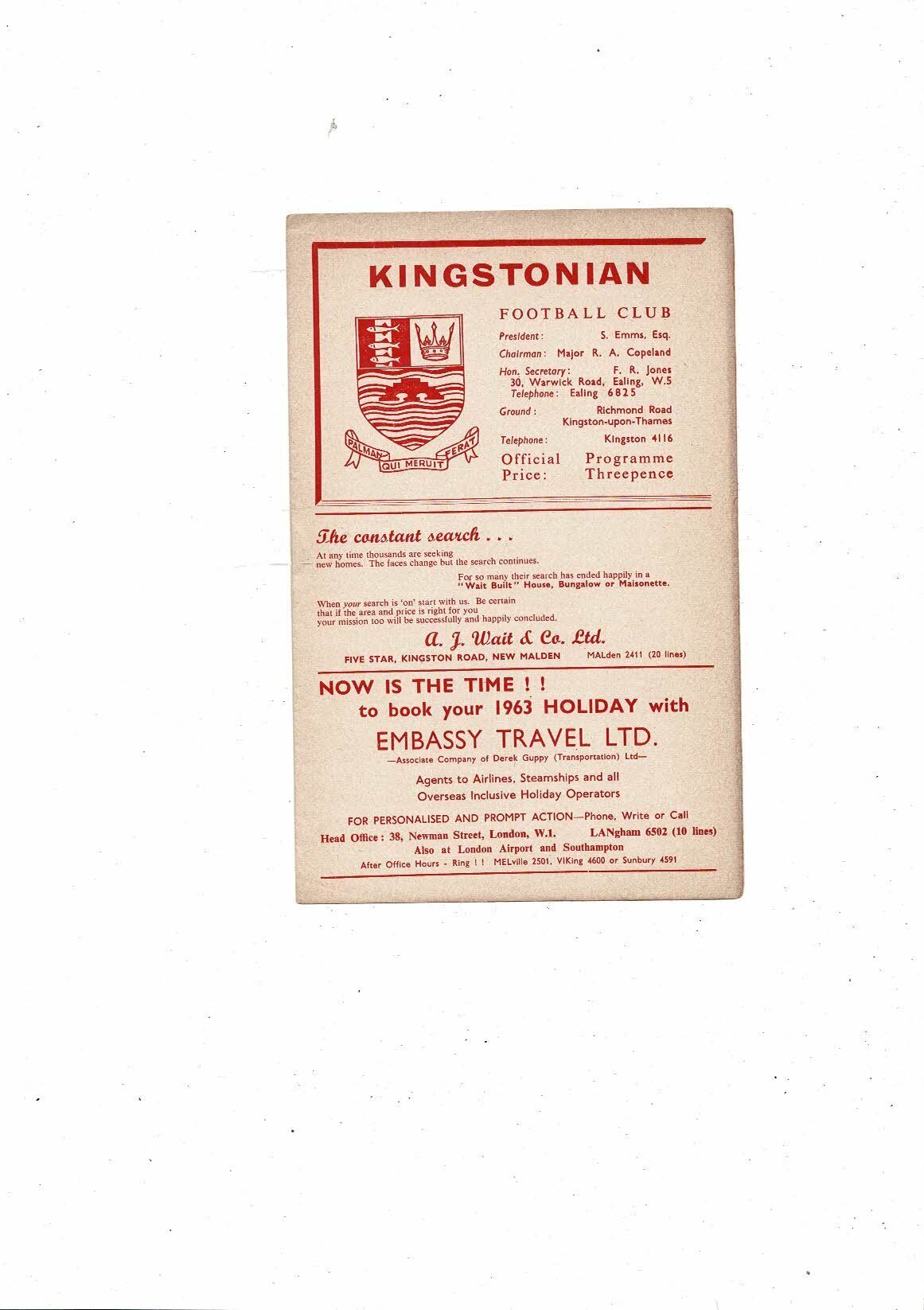 1962/63 Kingstonian v Barking Isthmian League Football Programme