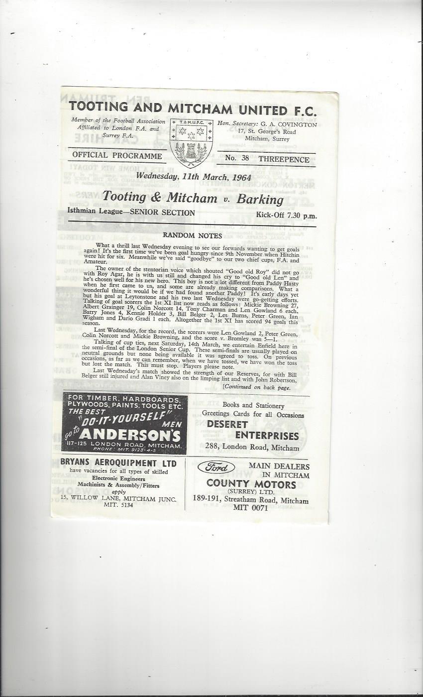 1963/64 Tooting & Mitcham United v Barking Football Programme
