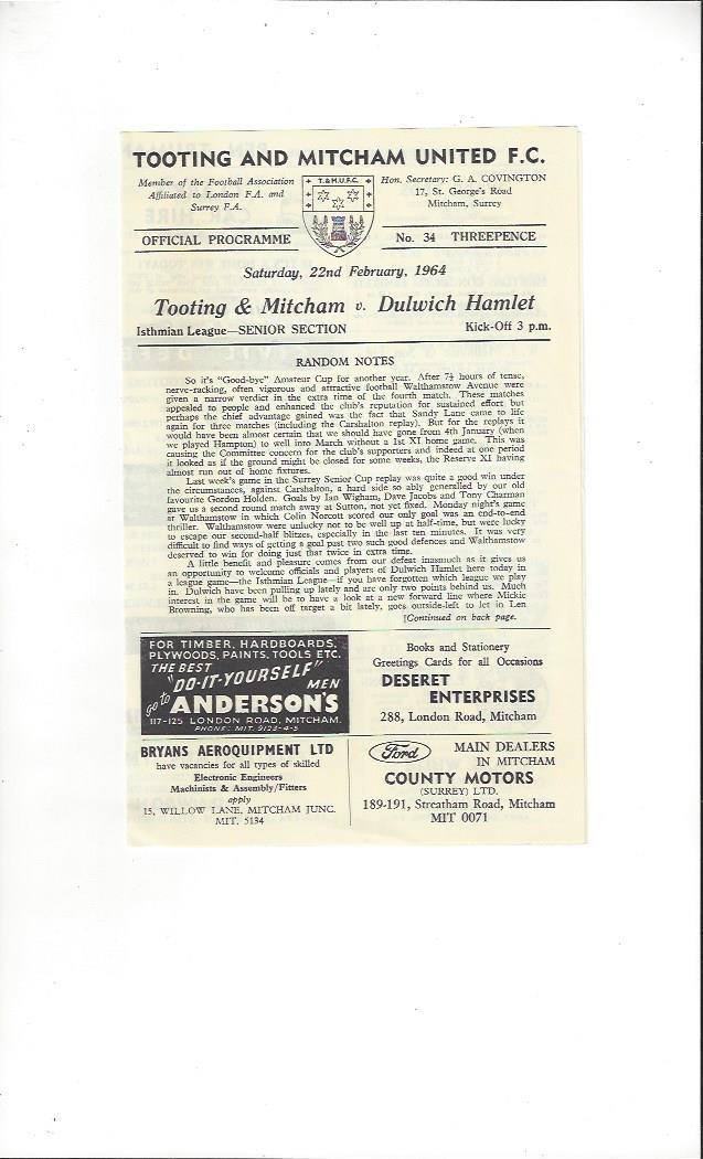 1963/64 Tooting & Mitcham United v Dulwich Hamlet Football Programme