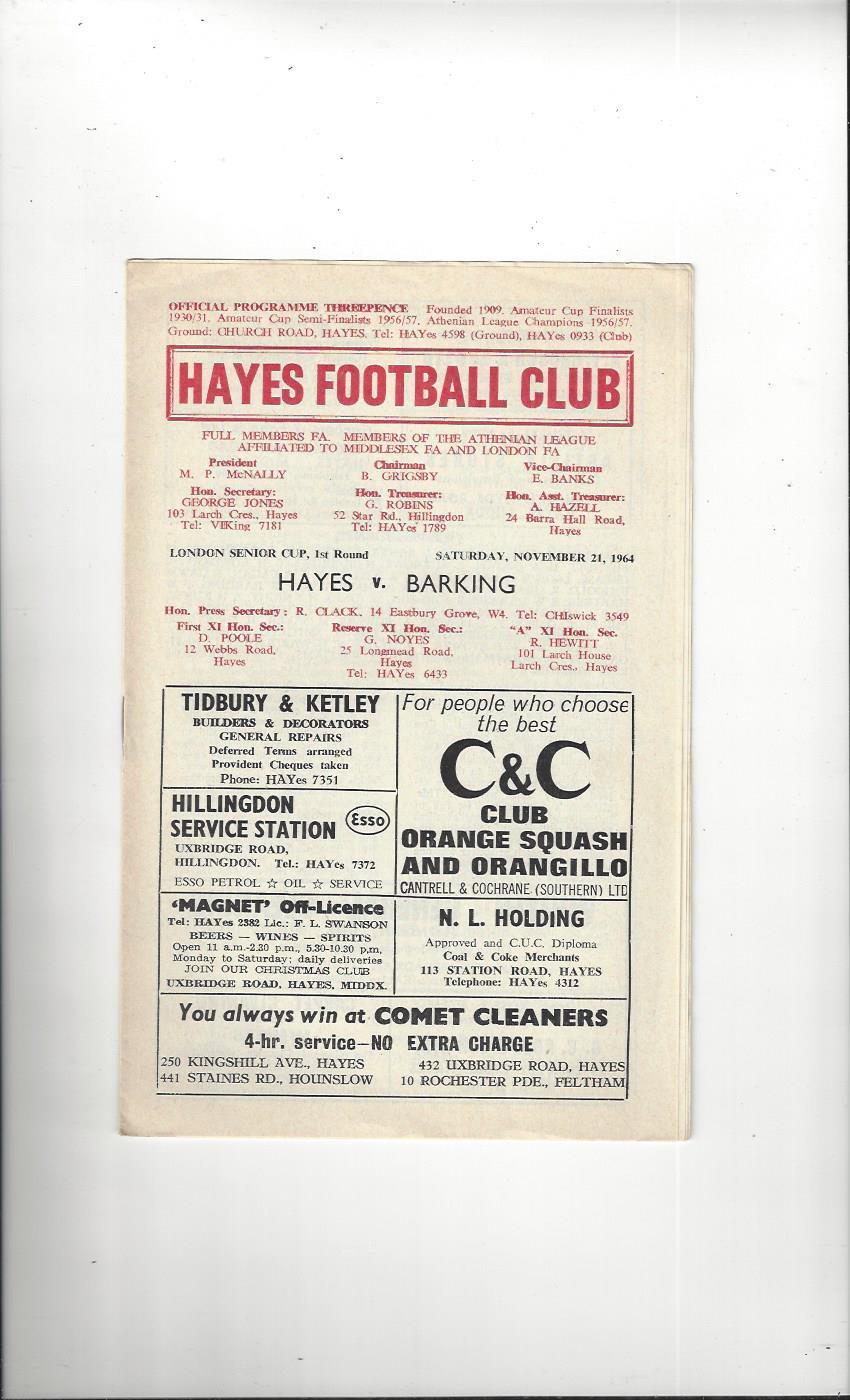 1964/65 Hayes v Barking London Senior Cup Football Programme
