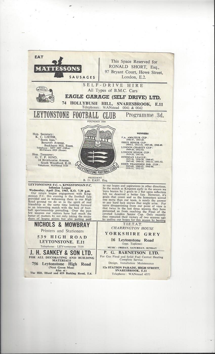 1964/65 Leytonstone v Kingstonian Football Programme