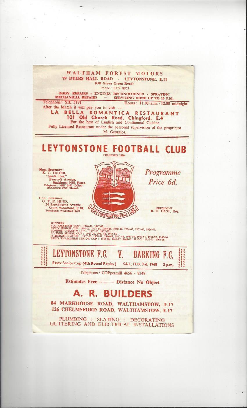 1967/68 Leytonstone v Barking Essex Senior Cup Replay Football Programme
