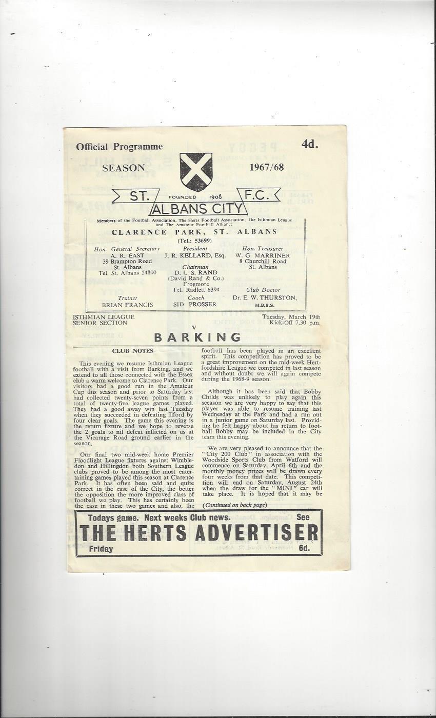 1967/68 St Albans City v Barking Football Programme