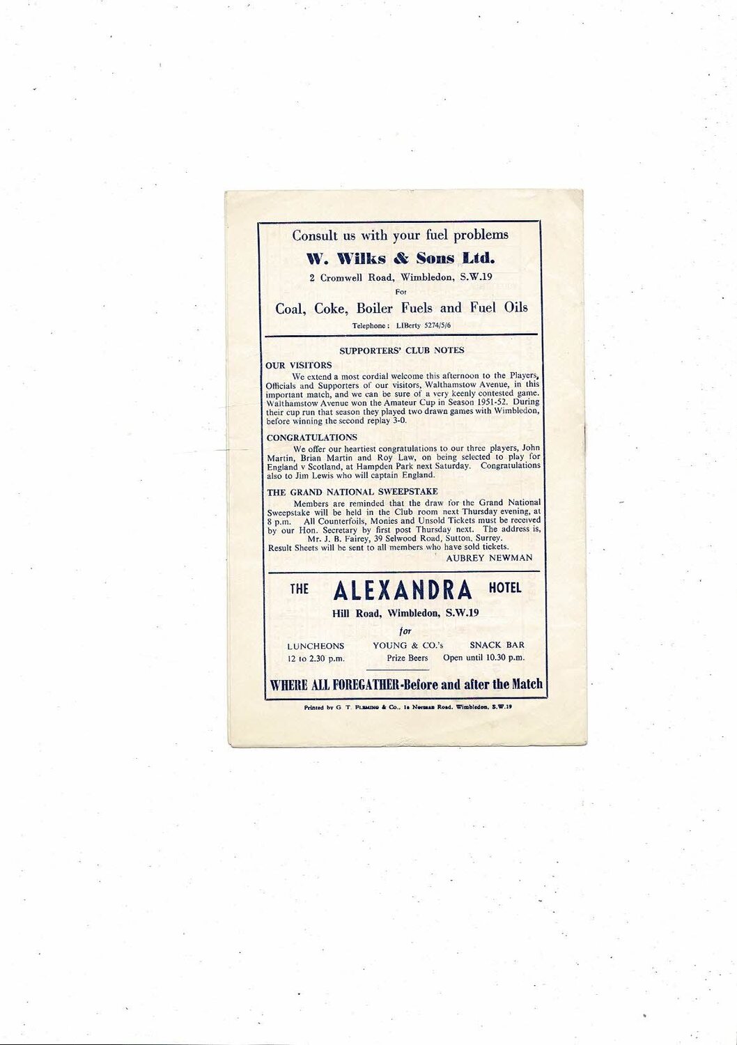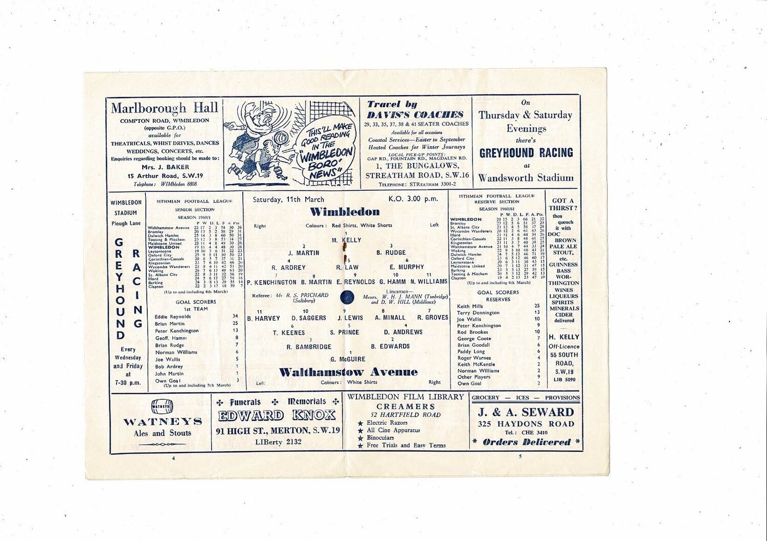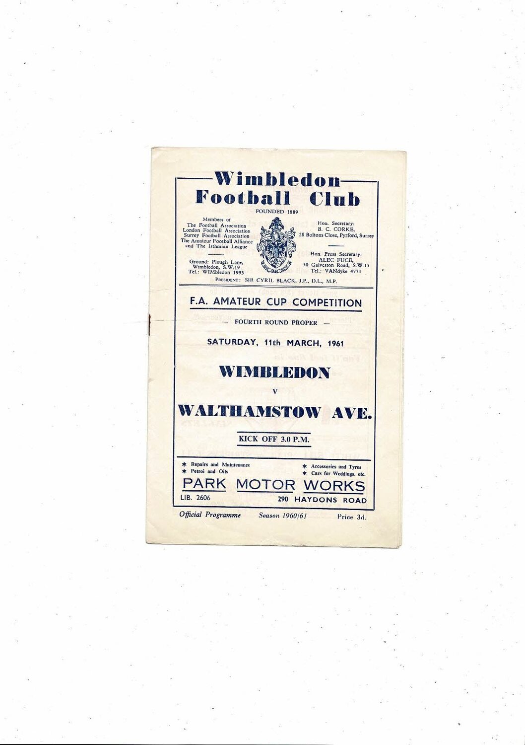 1960/61 Wimbledon v Walthamstow Avenue FA Amateur Cup Football Programme