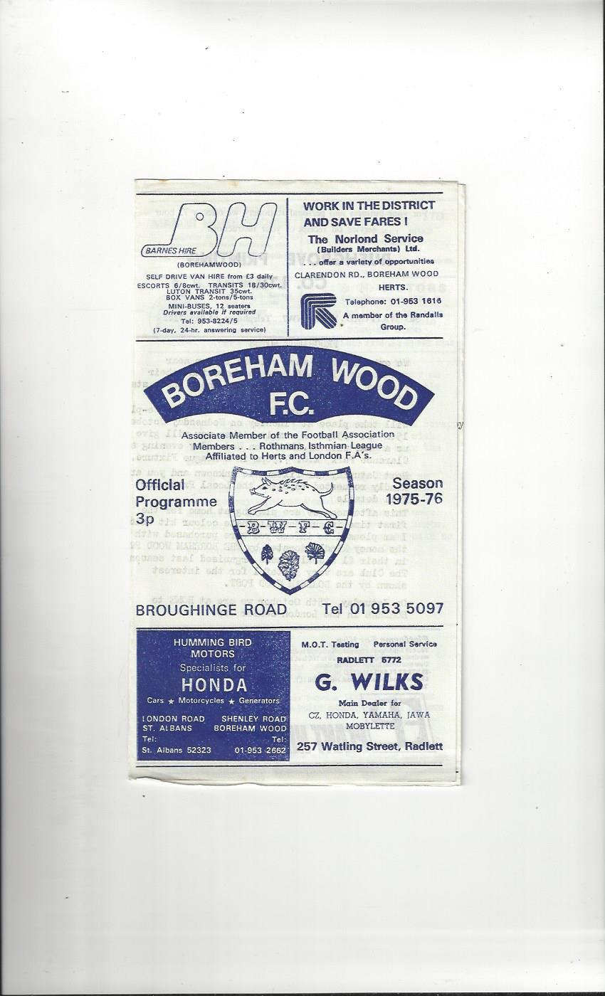 Boreham Wood v Finchley FA Trophy Football Programme 1975/76