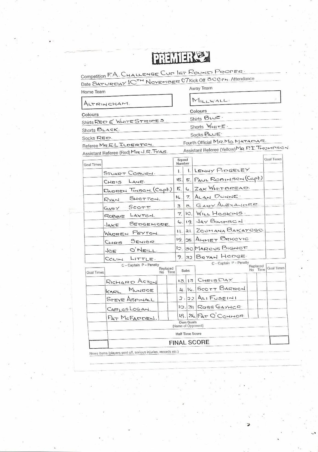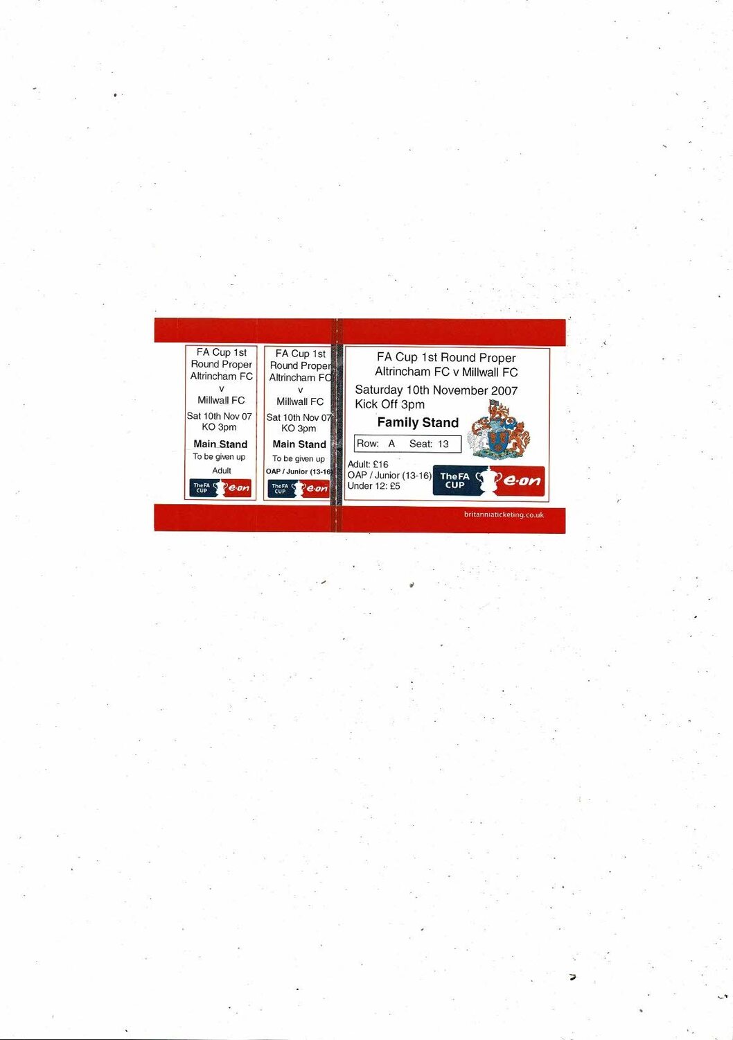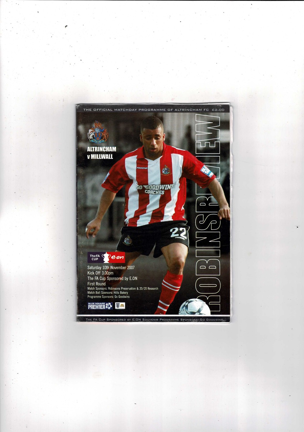 Altrincham v Millwall FA Cup Football Programme 2007/08 + Team Sheet & Match Ticket
