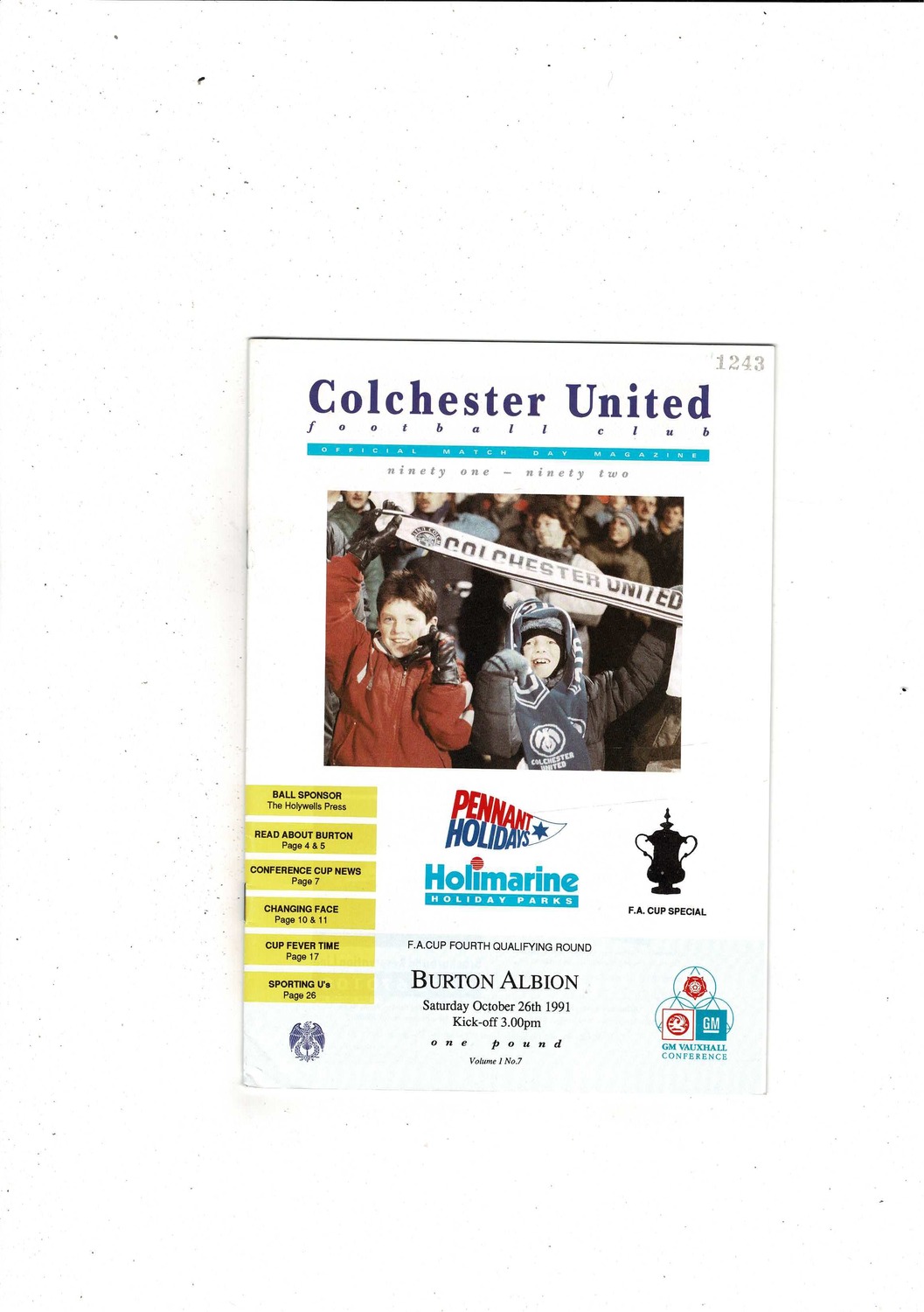 Colchester United v Burton Albion FA Cup Football Programme 1991/92
