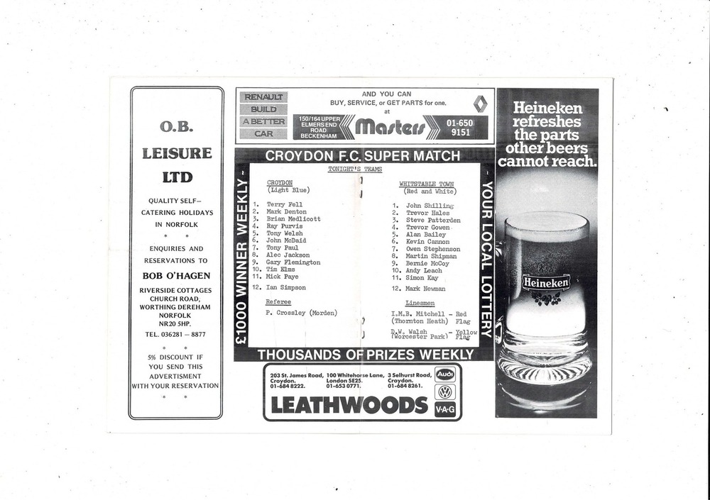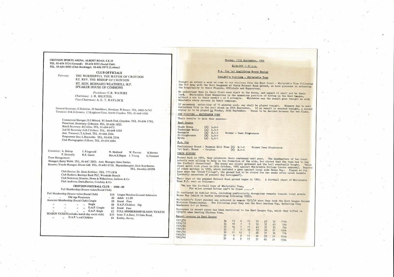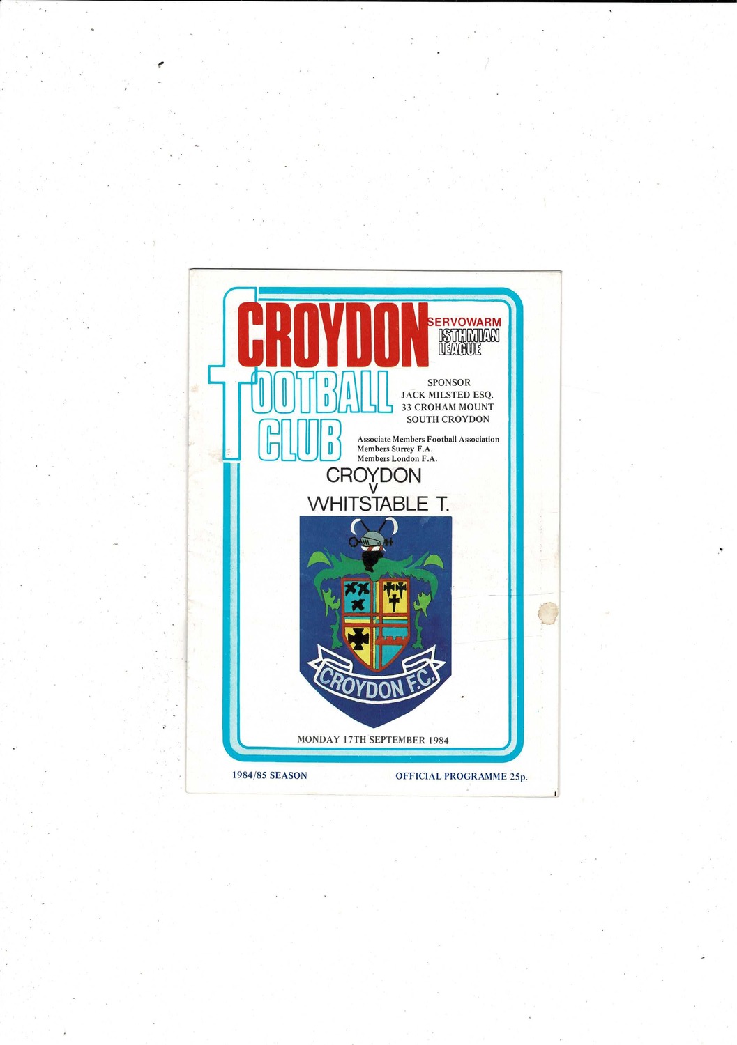 Croydon v Whitstable Town FA Cup Football Programme 1984/85