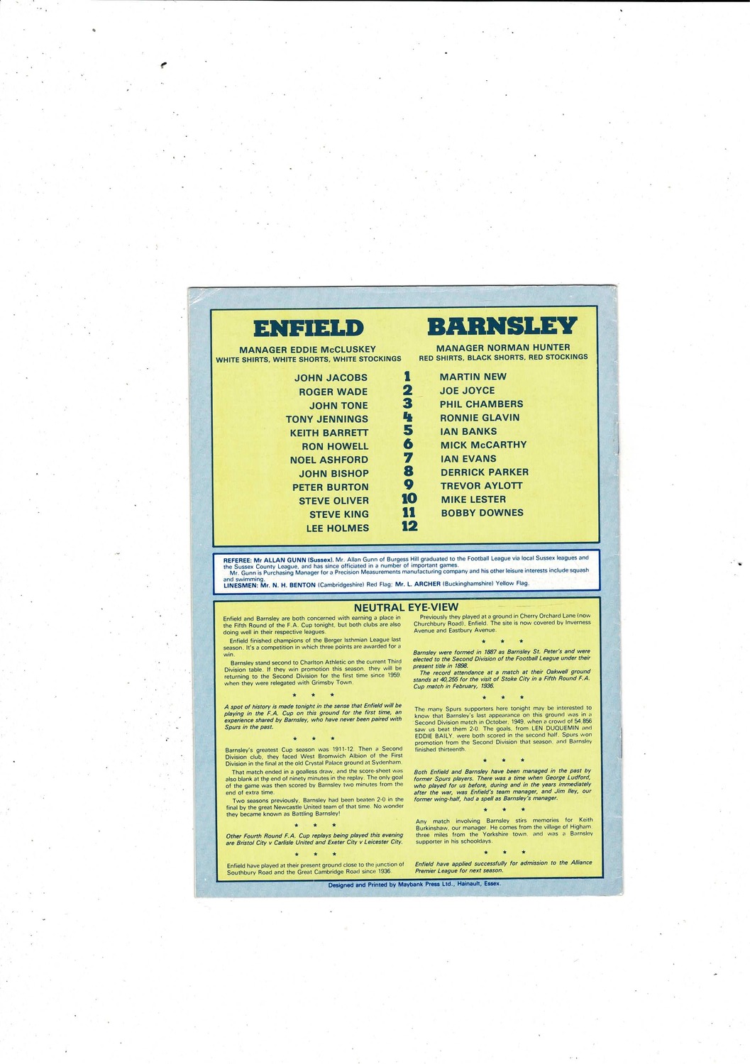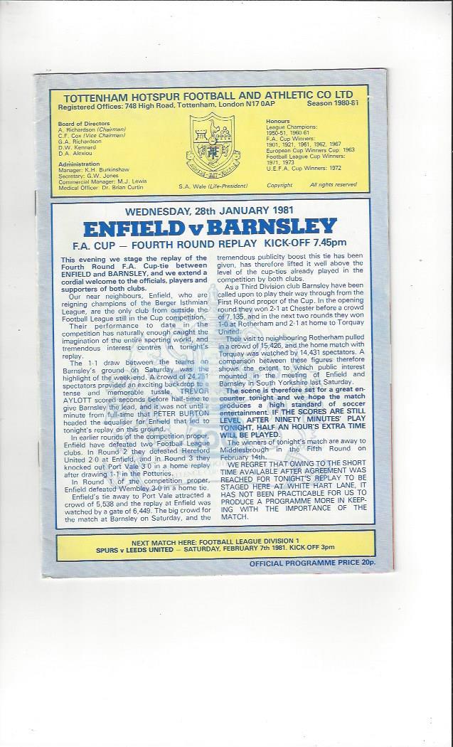 Enfield v Barnsley FA Cup Replay Football Programme 1980/81 @ Spurs