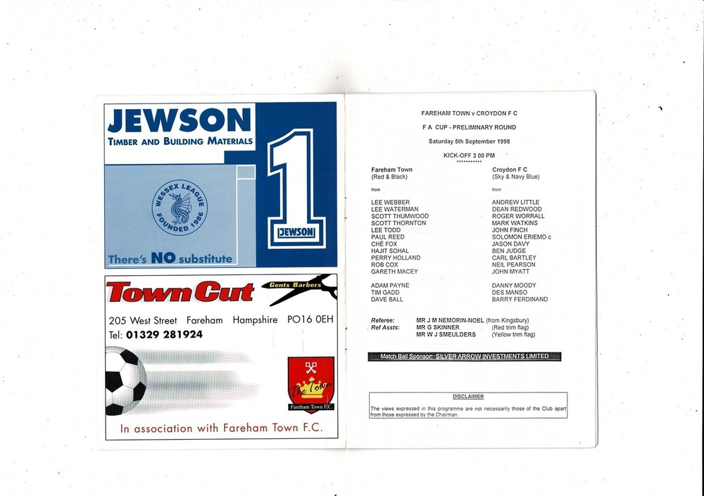 Fareham Town v Croydon FA Cup Football Programme 1998/99