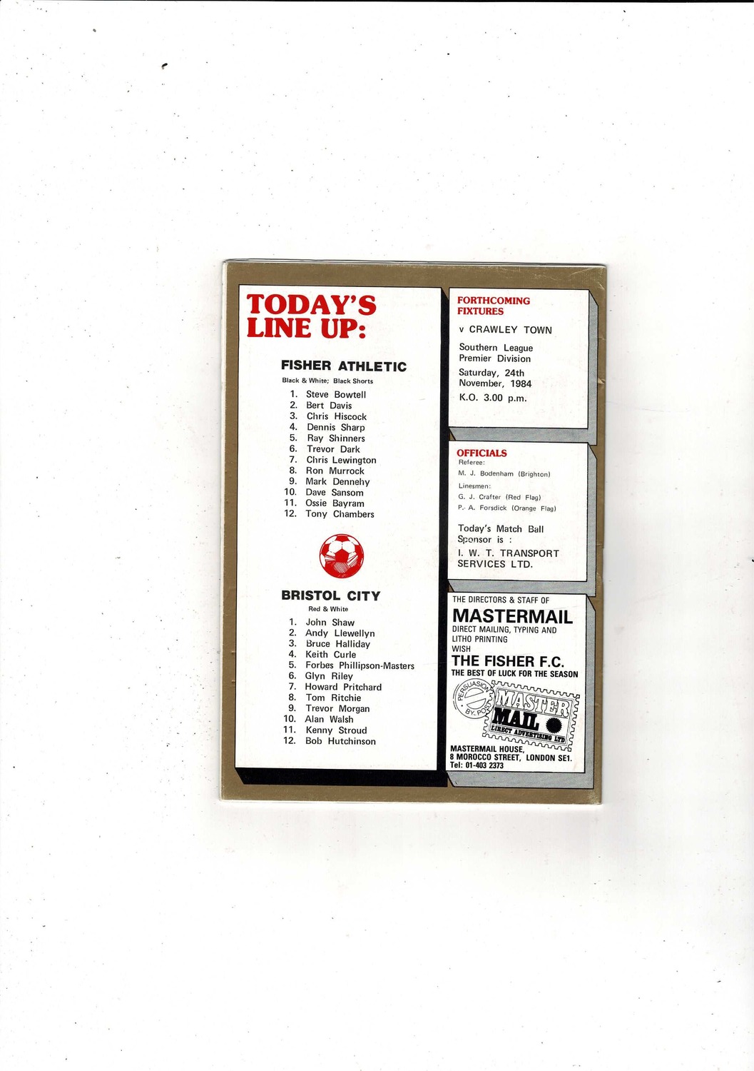 Fisher Athletic v Bristol City FA Cup Football Programme 1984/85