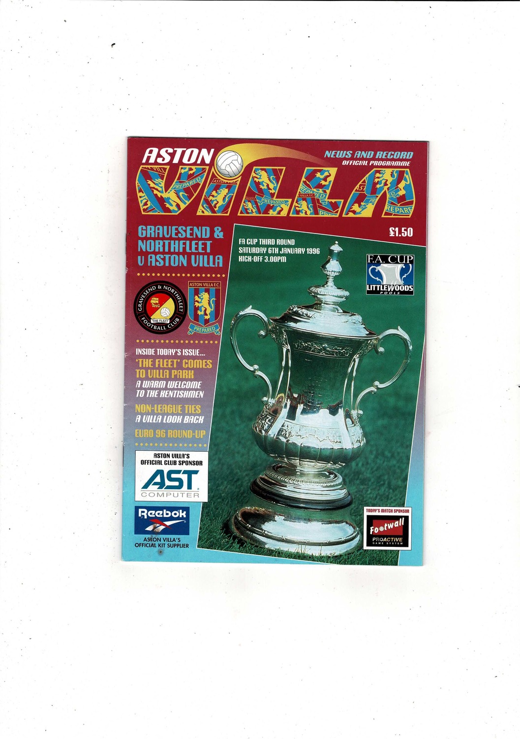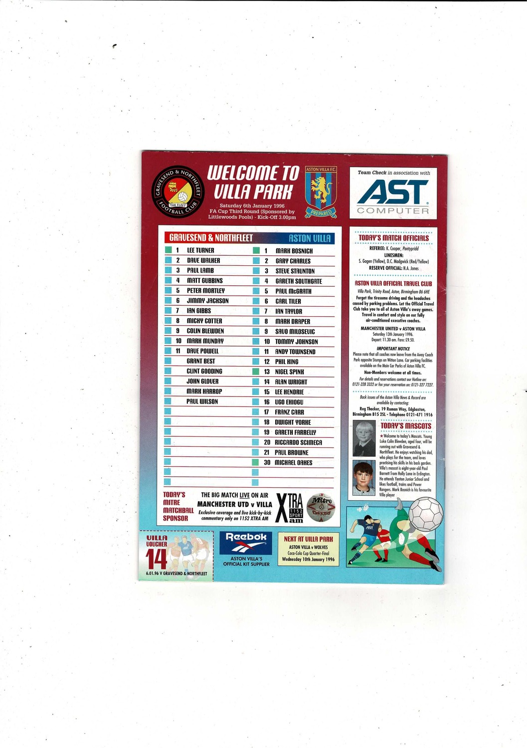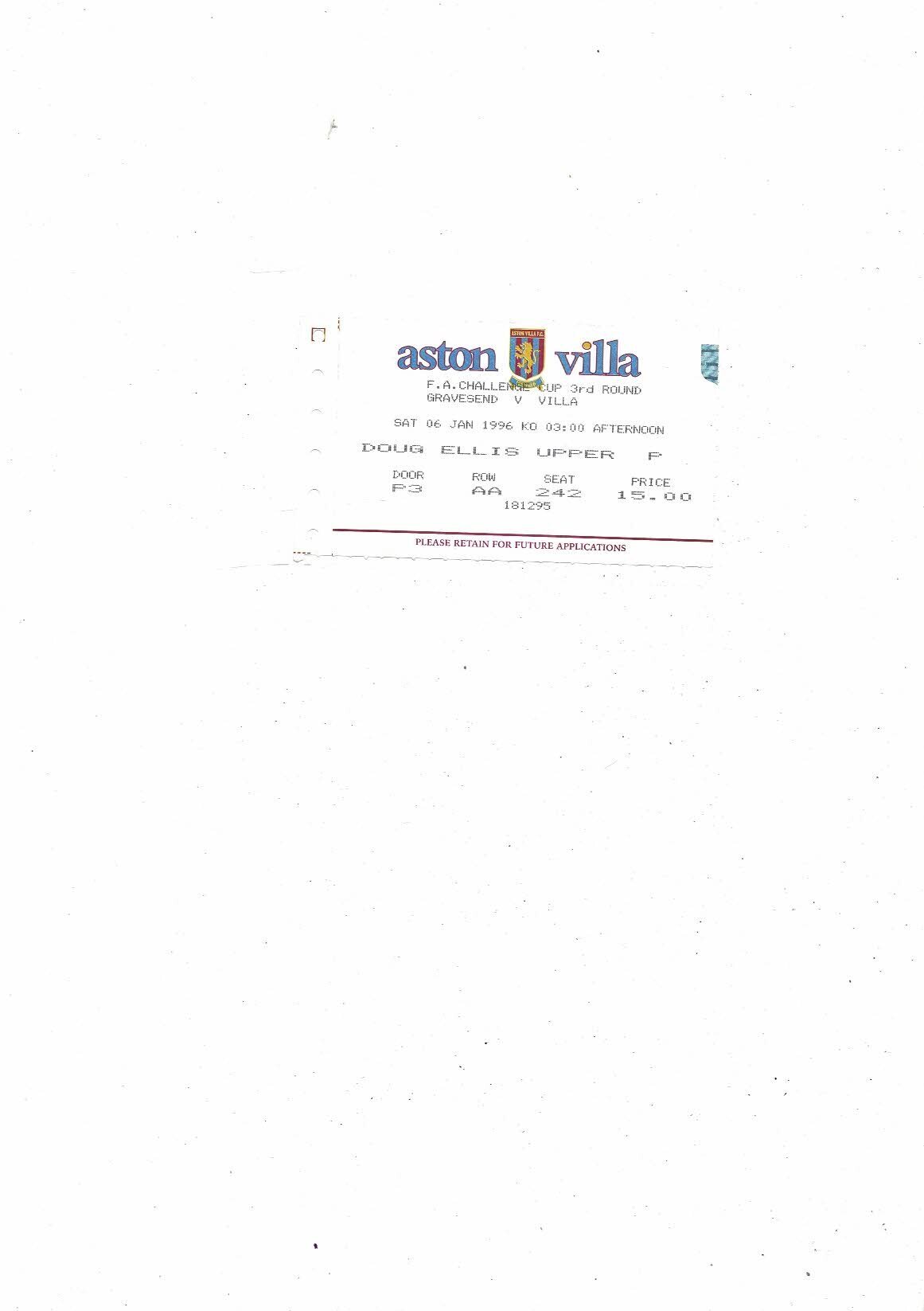 Gravesend & Northfleet v Aston Villa FA Cup Football Programme + Ticket 1995/96 @ Aston Villa