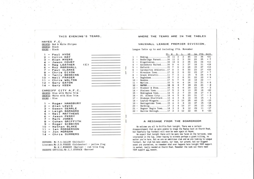 Hayes v Cardiff City FA Cup Replay Football Programme 1990/91 @ Brentford