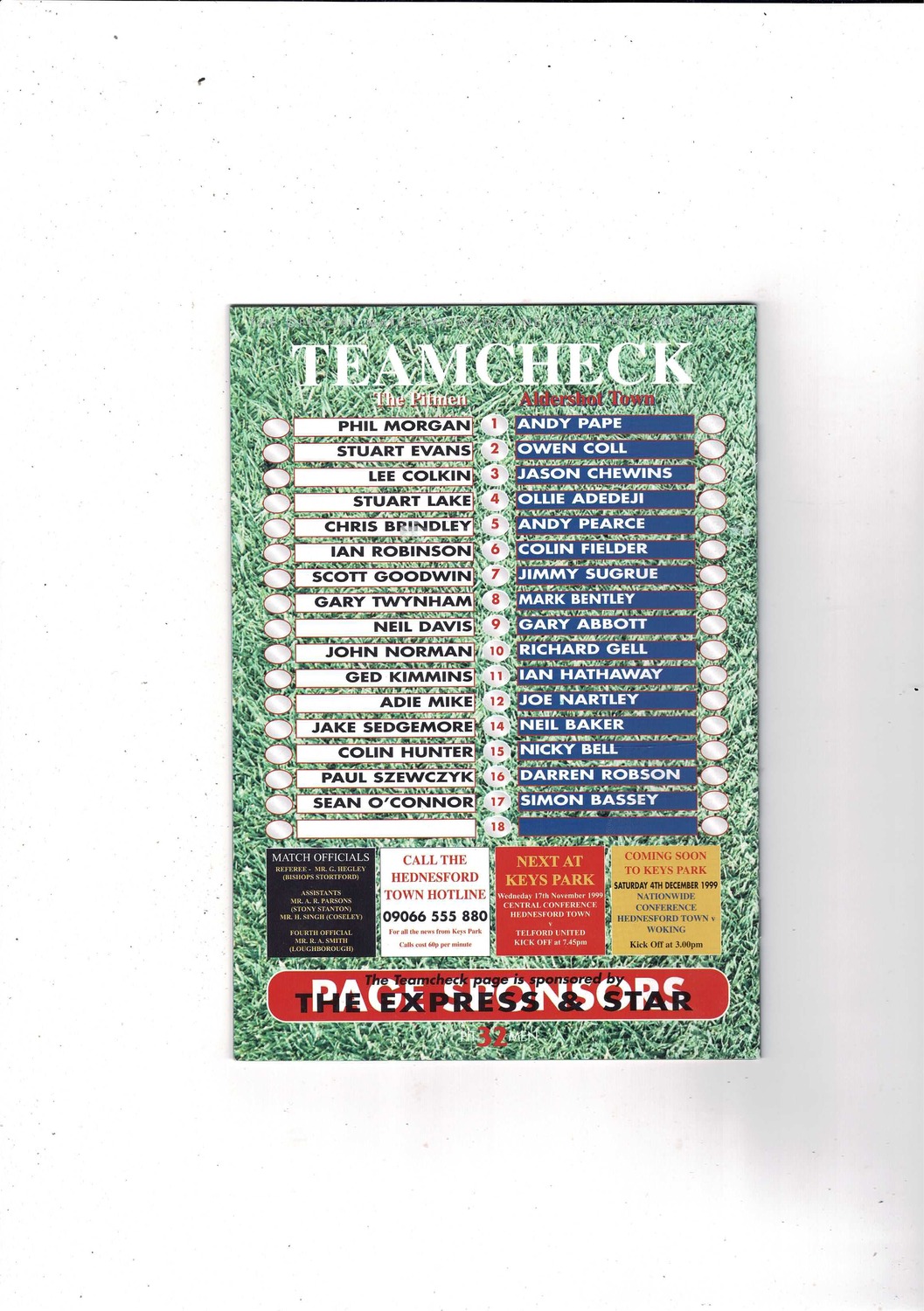 Hednesford Town v Aldershot Town FA Cup Replay Football Programme 1999/00