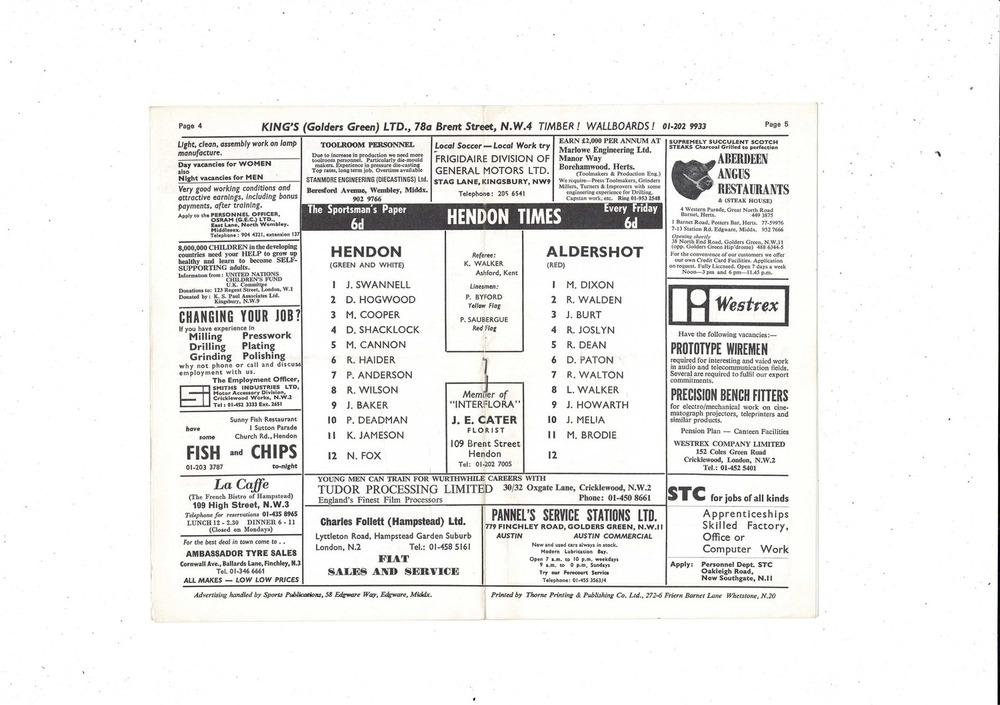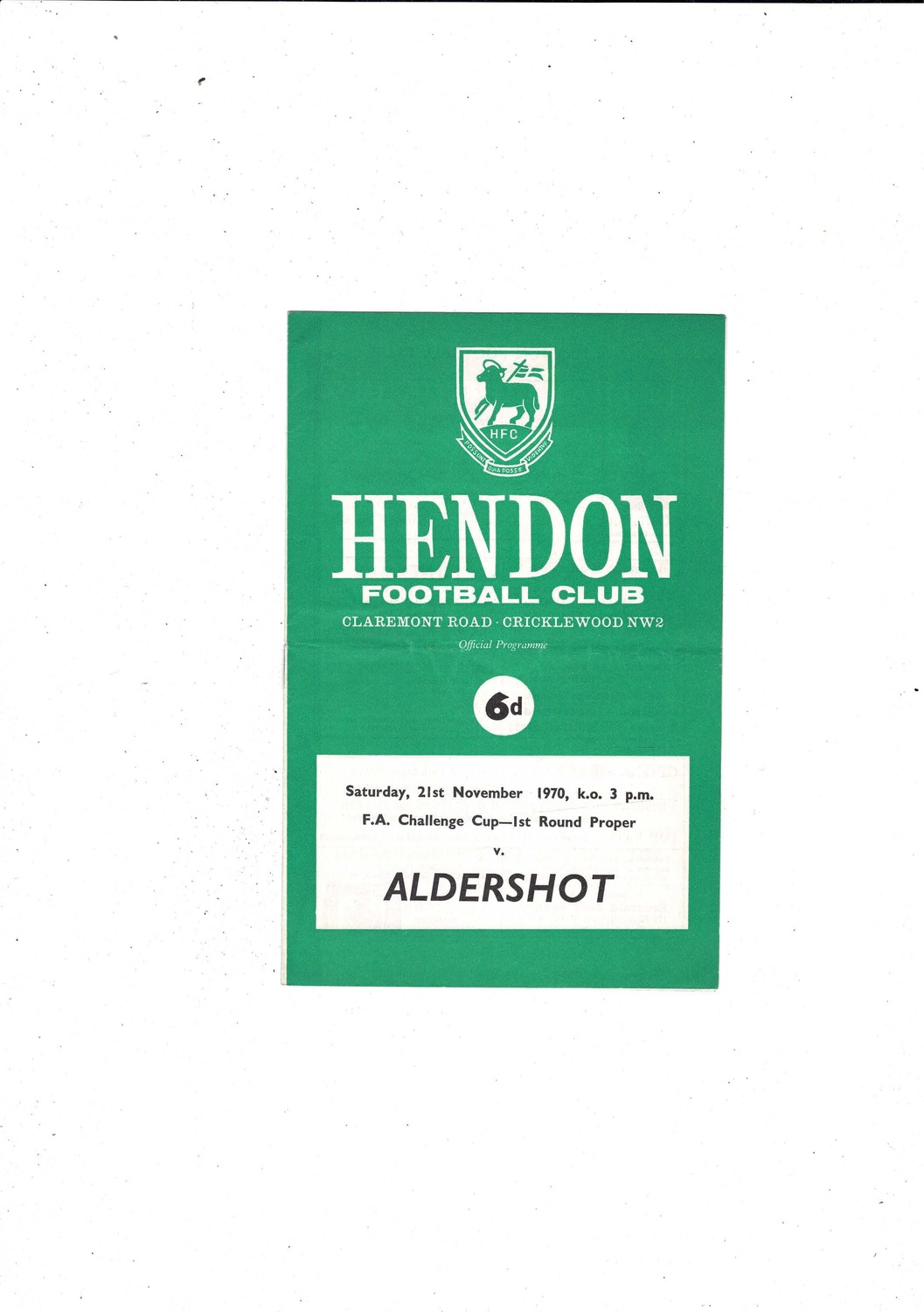 Hendon v Aldershot FA Cup Football Programme 1970/71