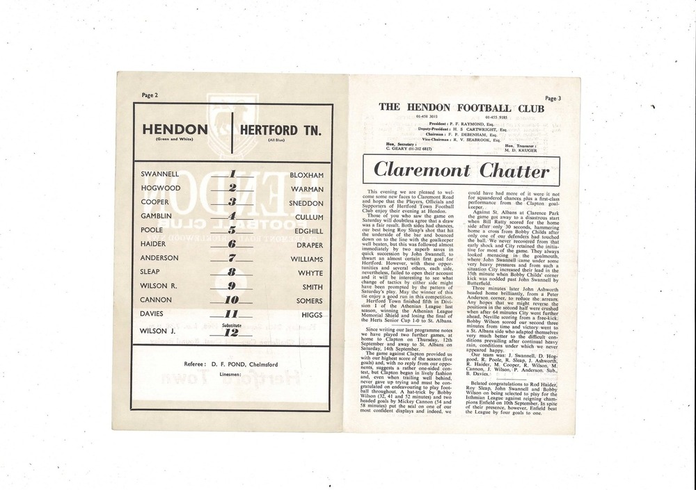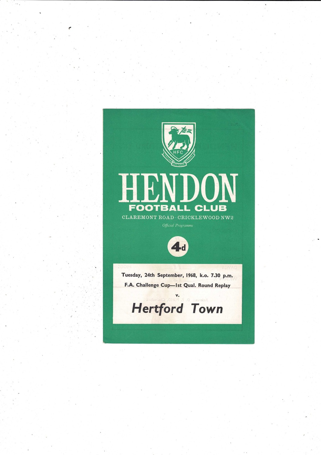 Hendon v Hertford Town FA Cup Replay Football Programme 1968/69