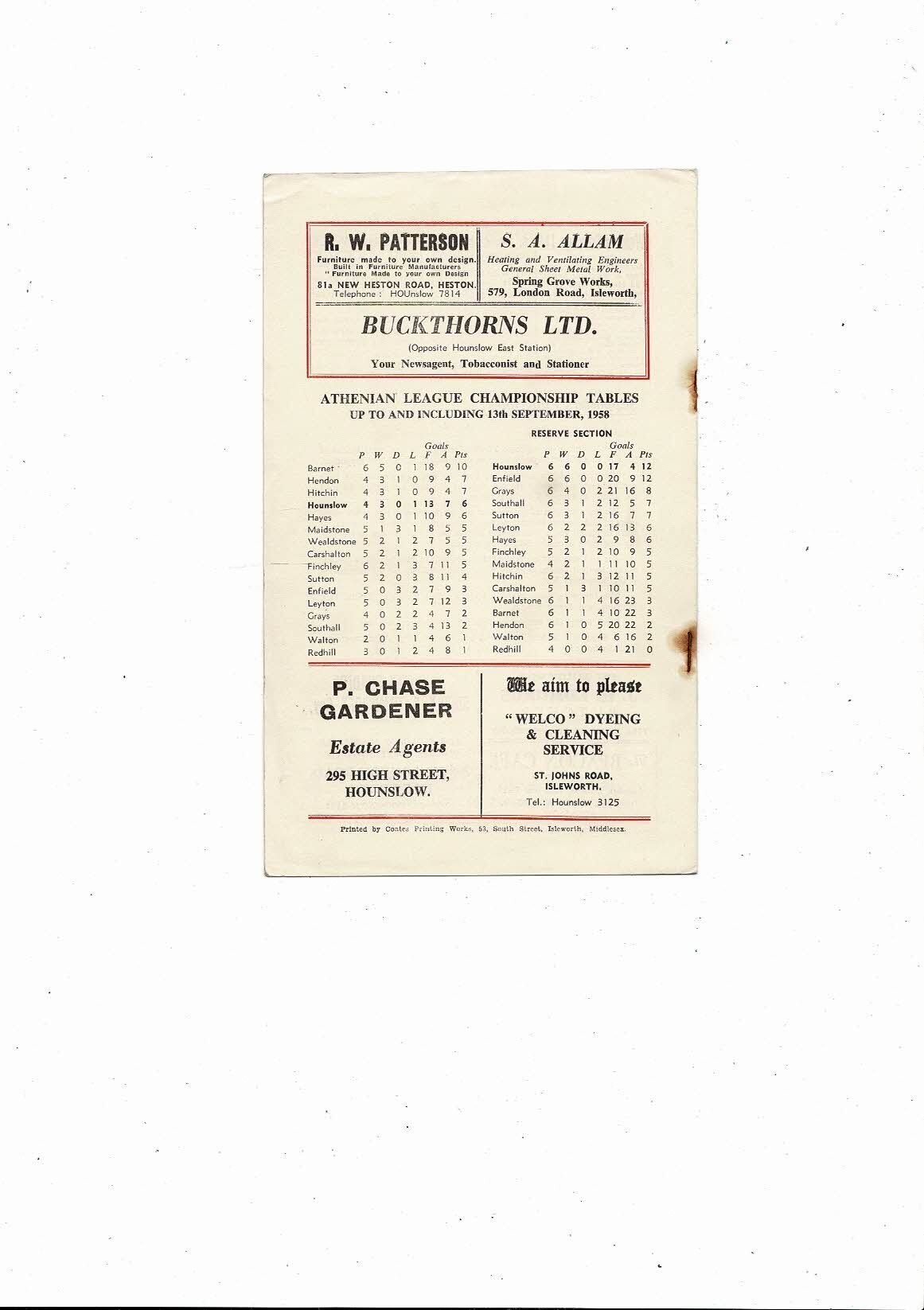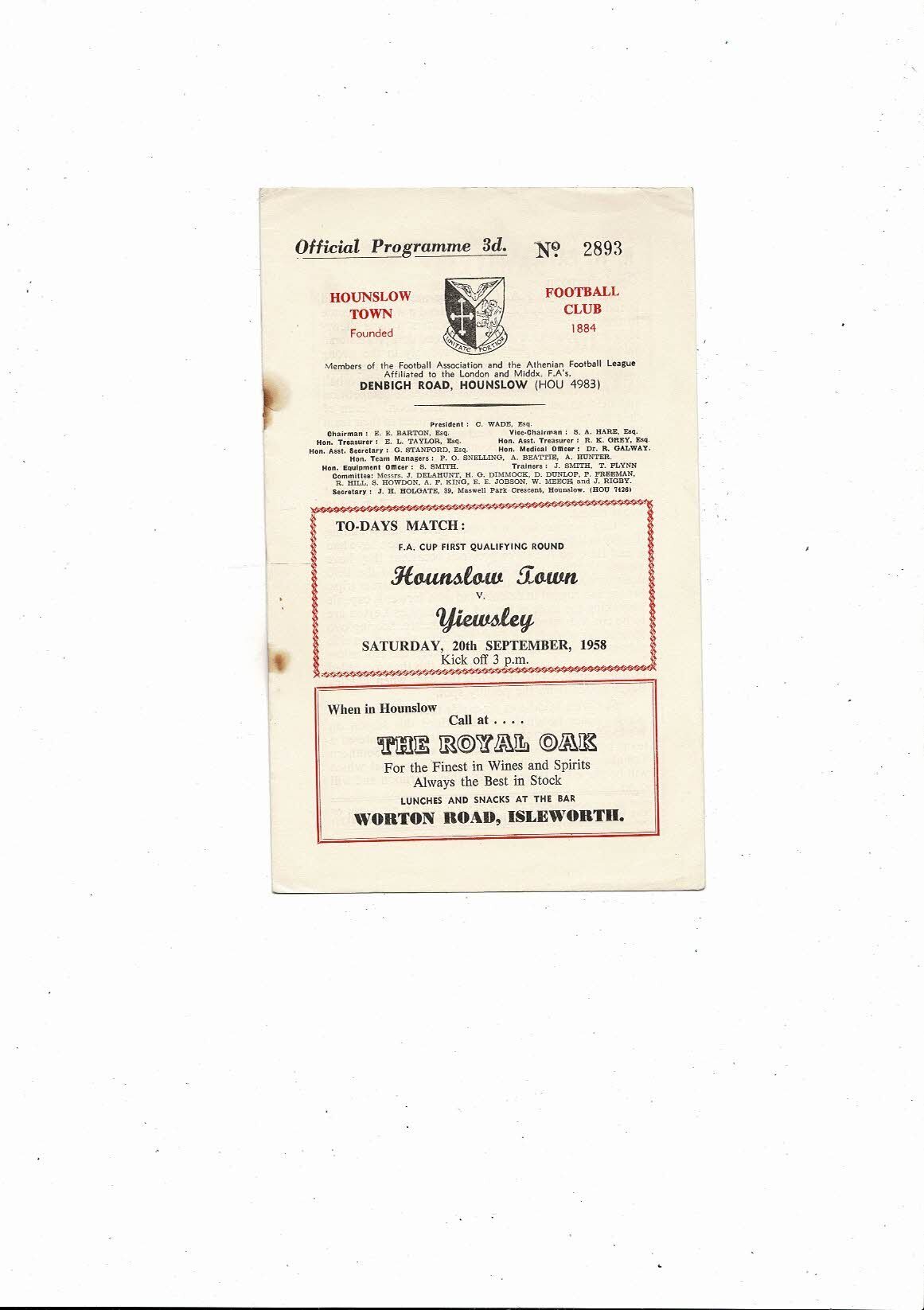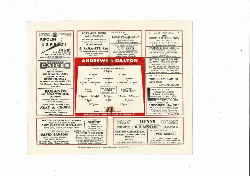 Hounslow Town v Yiewsley FA Cup Football Programme 1958/59