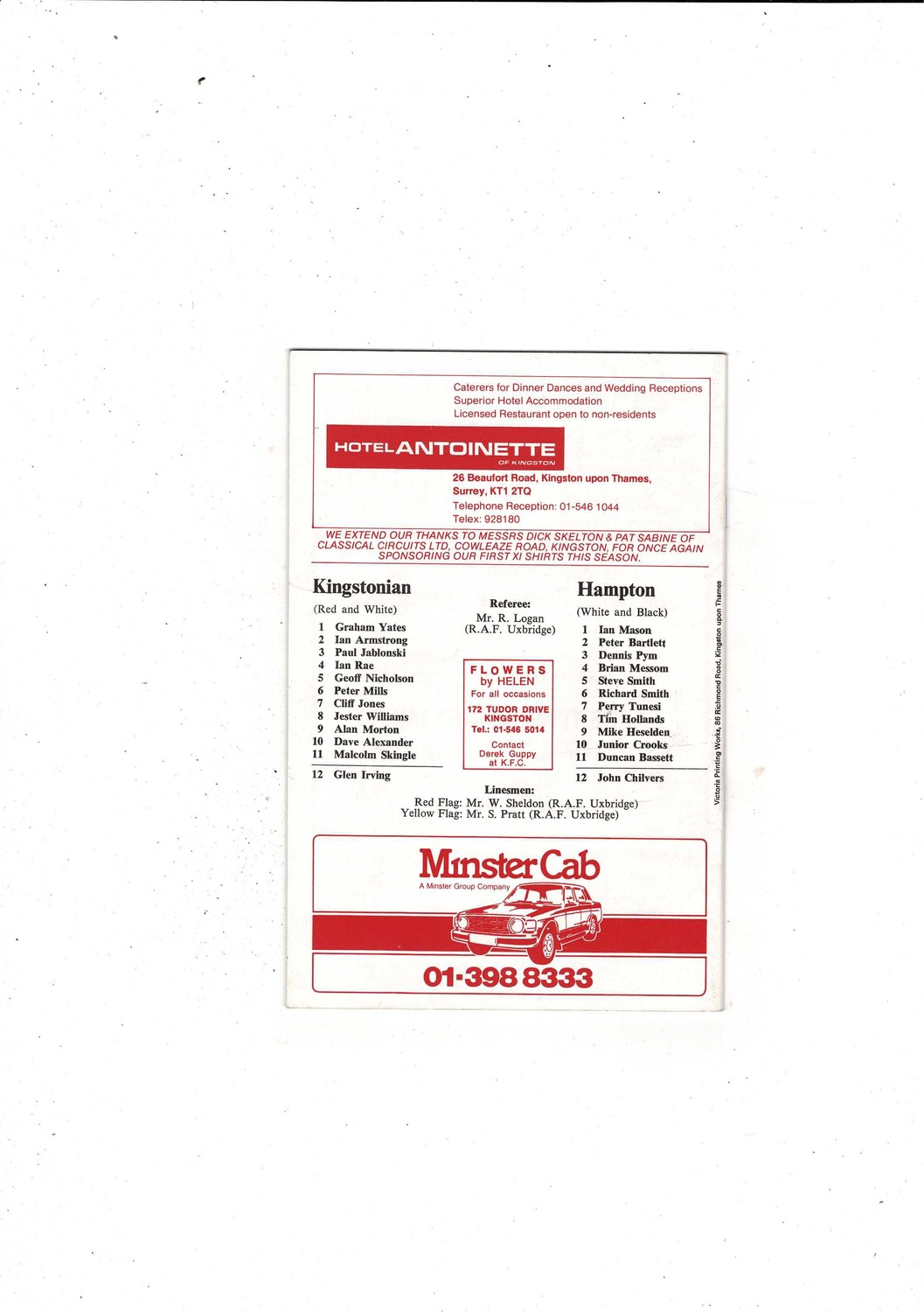 Kingstonian v Hampton FA Cup Football Programme 1981/82