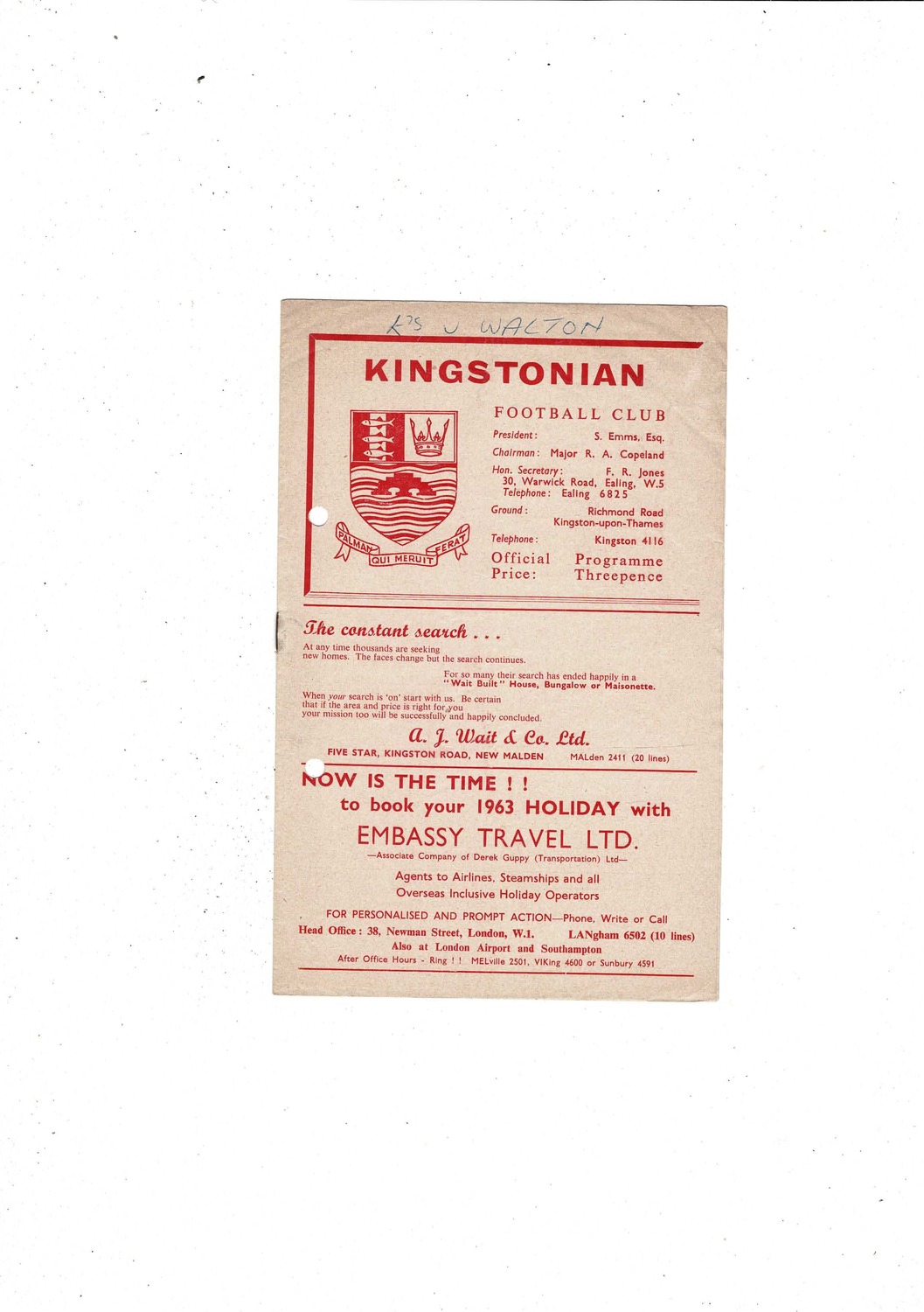Kingstonian v Walton & Hersham FA Cup Football Programme 1962/63