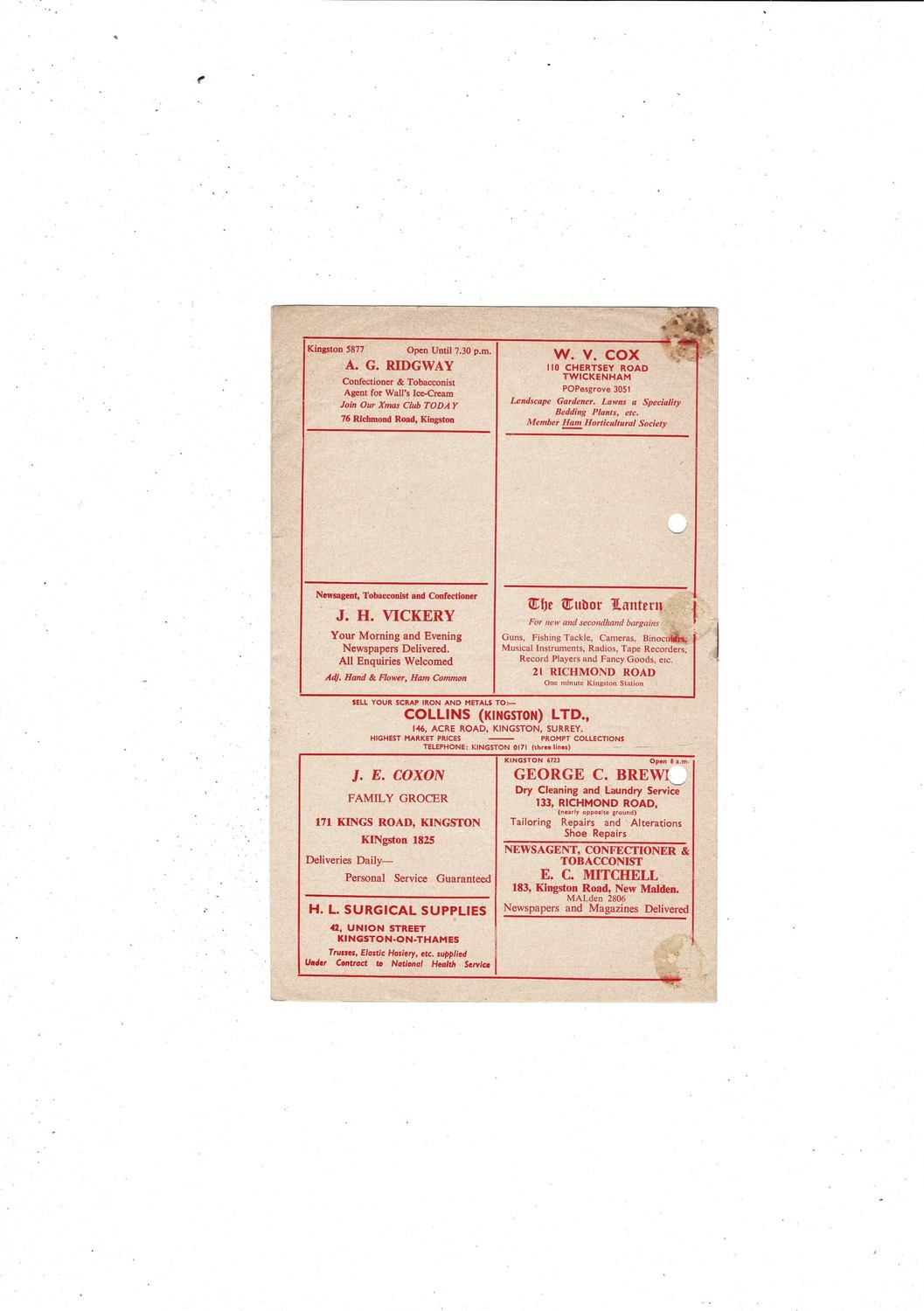 This Original Football Programme is creased with some staining, punched holes, name on front, score, scorers & name noted on team page.