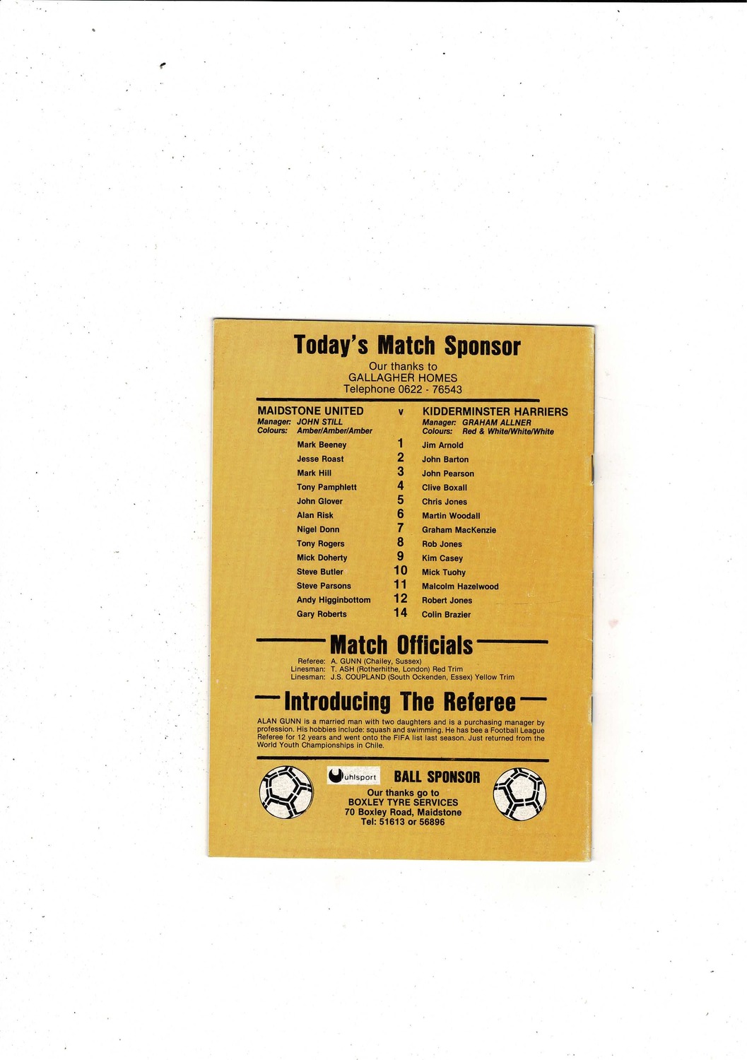 Maidstone United v Kidderminster Harriers FA Cup Rep Football Programme 1987/88