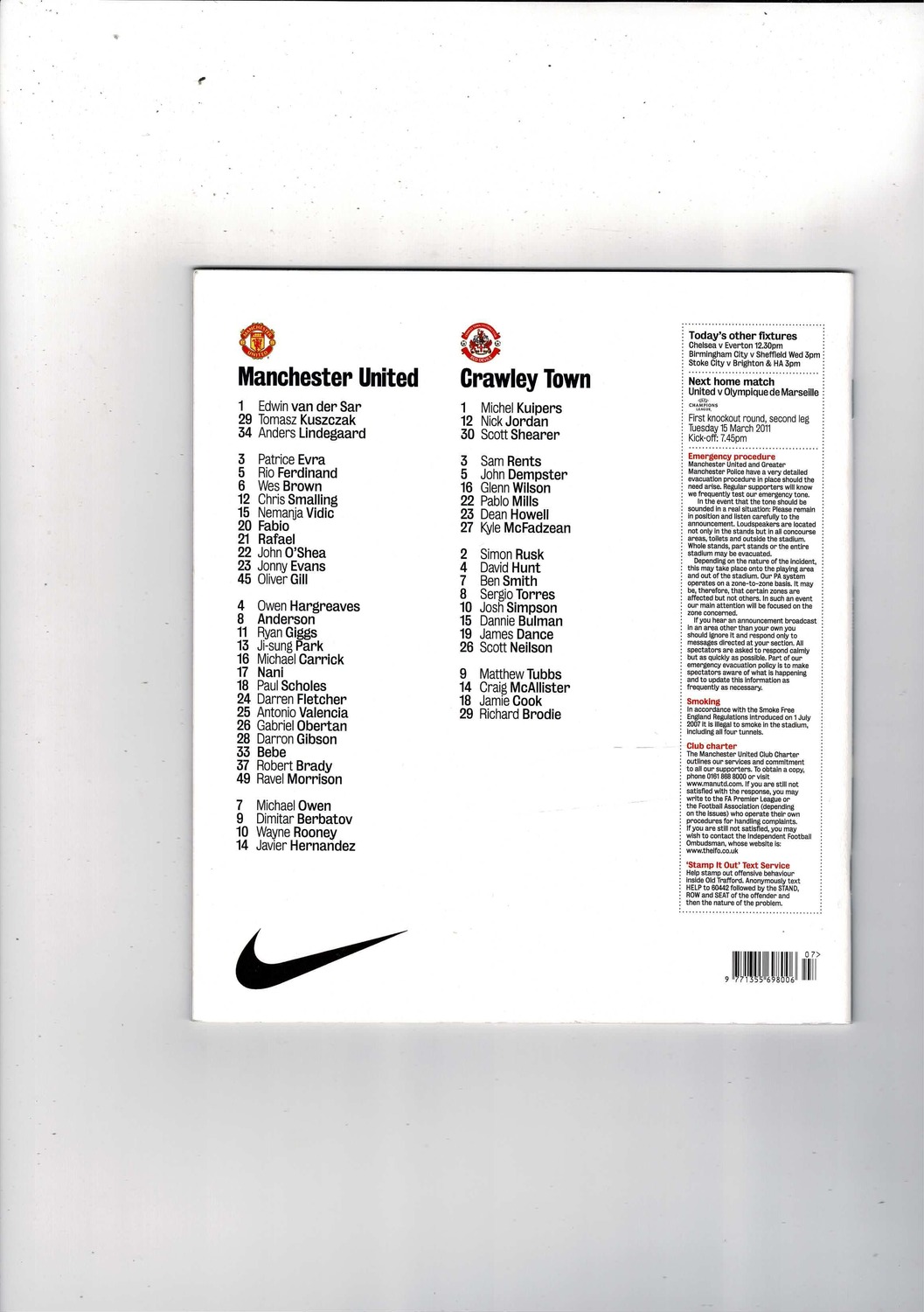 Manchester United v Crawley Town FA Cup Football Programme 2010/11