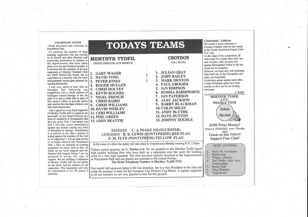 Merthyr Tydfil v Croydon FA Cup Football Programme + Press cutting 1987/88