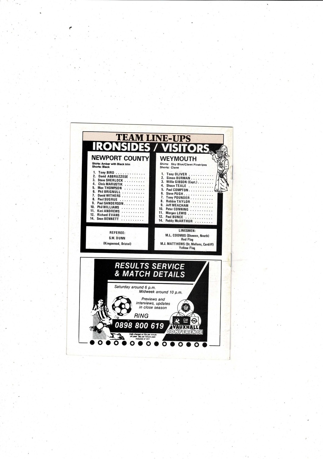 Newport County v Weymouth FA Cup Football Programme 1988/89