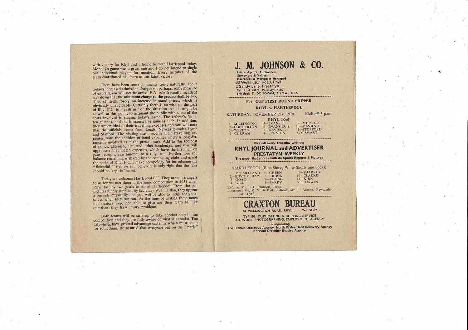Rhyl v Hartlepool United FA Cup Football Programme 1970/71