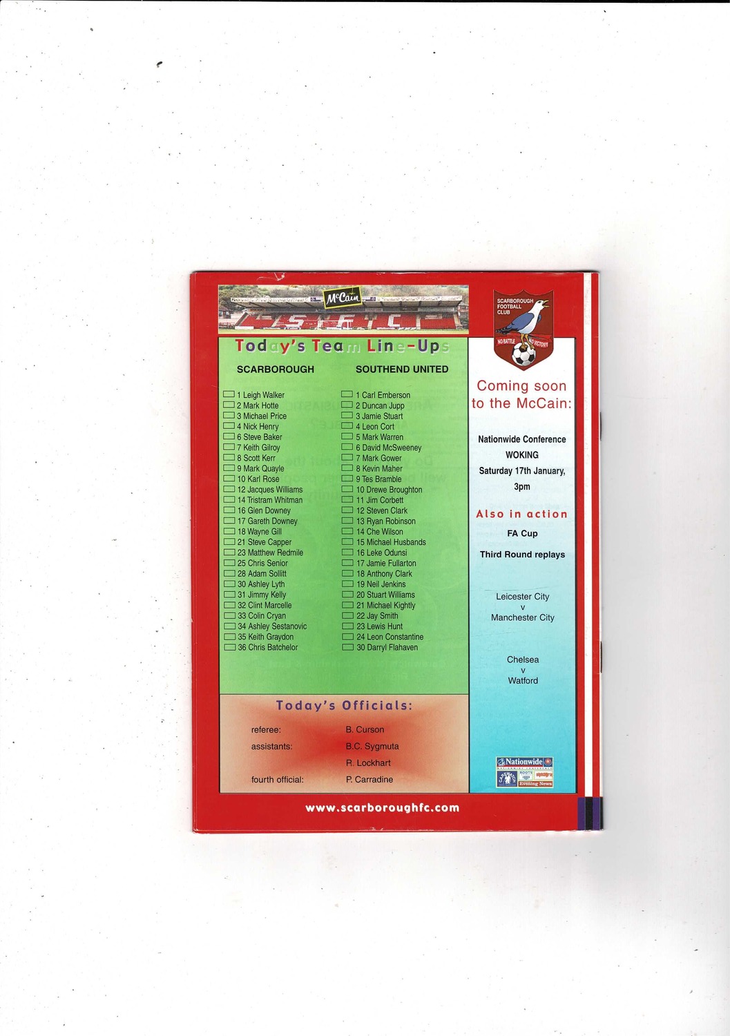 Scarborough v Southend United FA Cup Replay Football Programme 2003/04