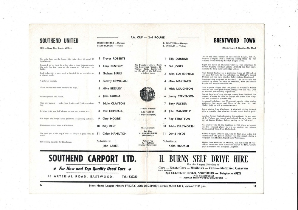 Southend United v Brentwood Town FA Cup Football Programme 1968/69