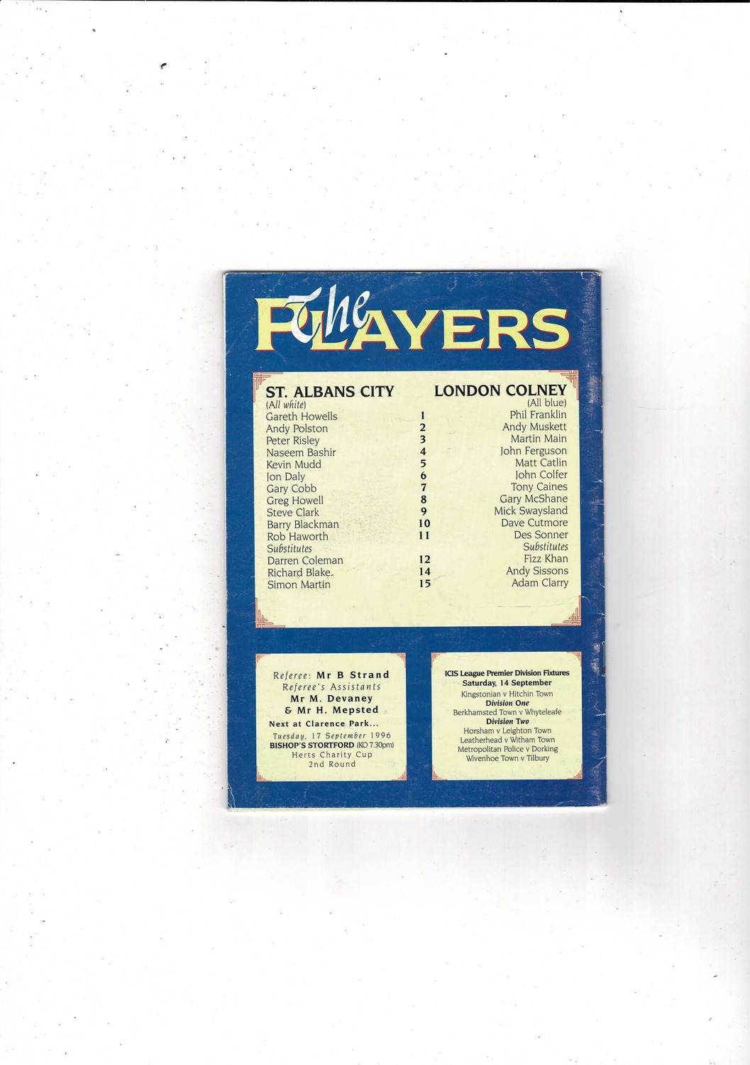 St. Albans City v London Colney FA Cup Football Programme 1996/97
